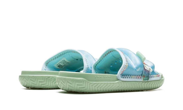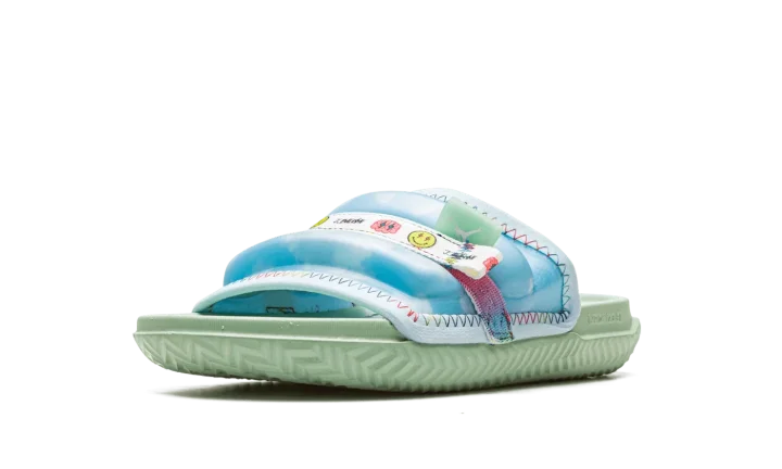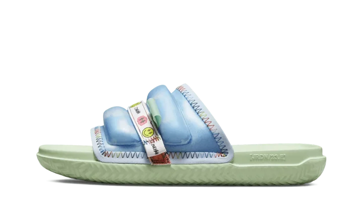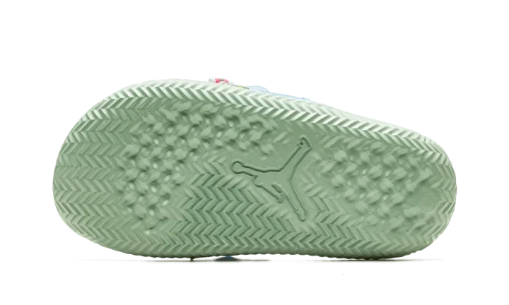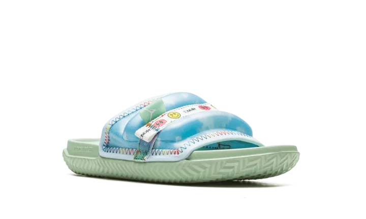 The J Balvin x Jordan Super Play Slide is a special collaboration between the Colombian musician and Jordan Brand on a casual slip-on sandal featuring the former's bold design aesthetic. The colorway features a similar, cloud-like design as J Balvin's Air Jordan 2 from 2022. A blue textile overlay on the midfoot arch displays J Balvin branding along with smiley face graphics. Contrasting rainbow zig-zag stitching borders the midfoot arch. The Seafoam Green midsole features glow-in-the-dark detailing. Release date: September 15, 2022