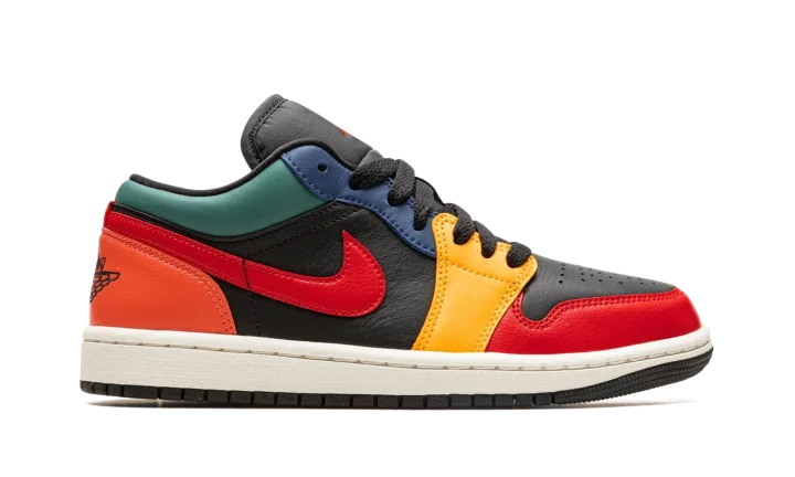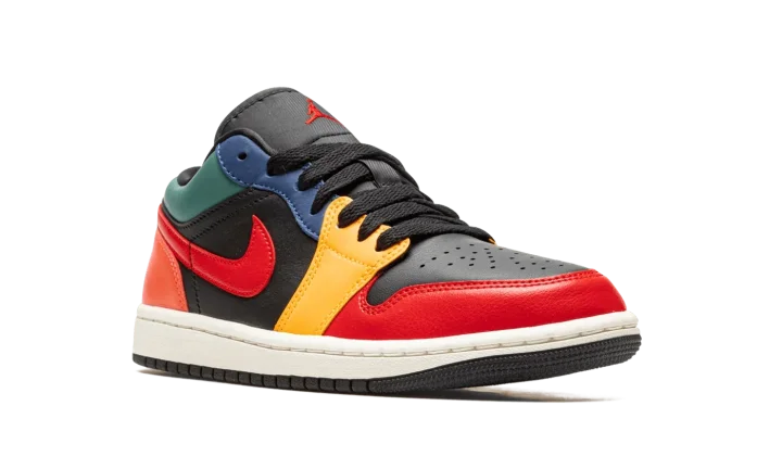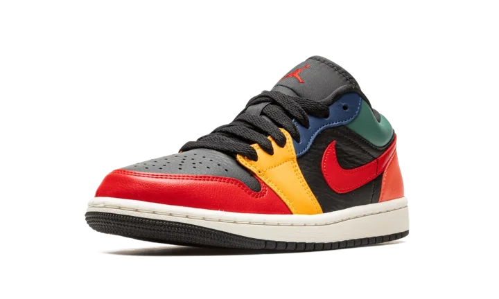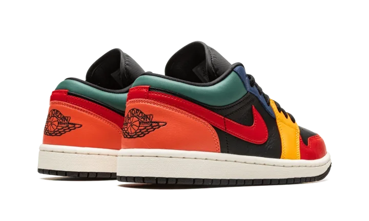 The Women's Air Jordan 1 Low "Black Multicolor" is a women's-exclusive colorway that combines various hues across its design. Reminiscent of the Women's Air Jordan 2 "Multi-Color," and other styles with a colorful appearance, the "Black Multicolor" is complete with a black leather base, and colorful leather overlays. A Fire Red leather Swoosh appears on either side of the shoe while a black "Wings" logo can be found on the heel. A red Jumpman is located on the black nylon tongue. A cream rubber midsole and black outsole complete the look.