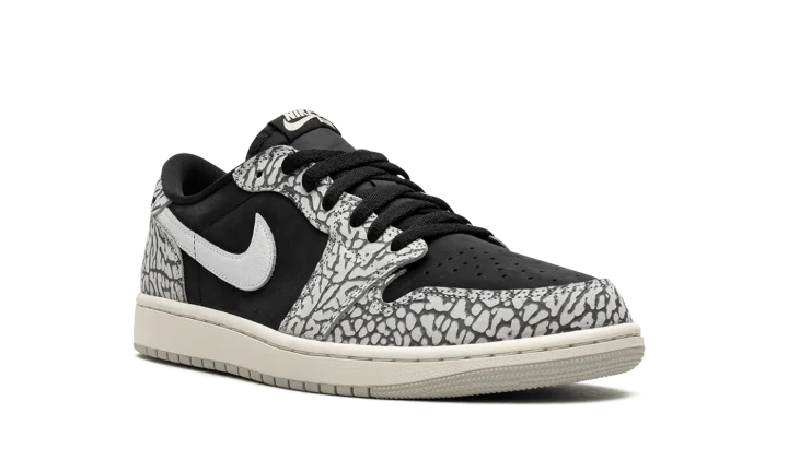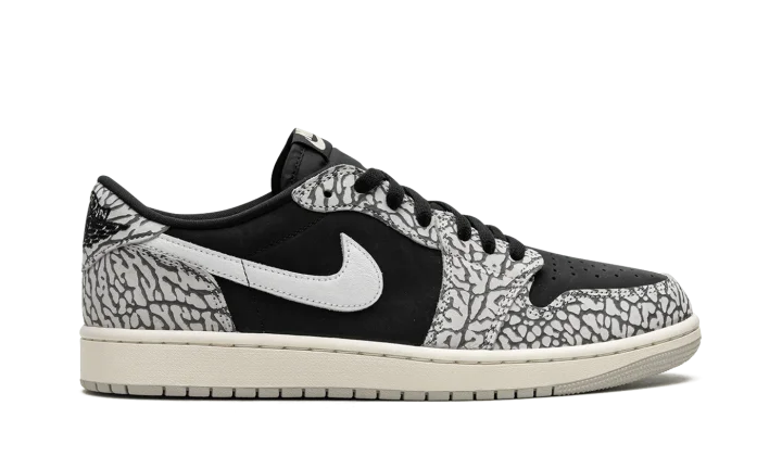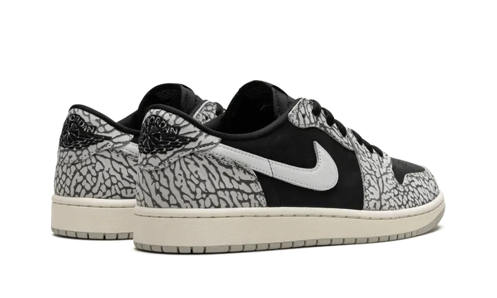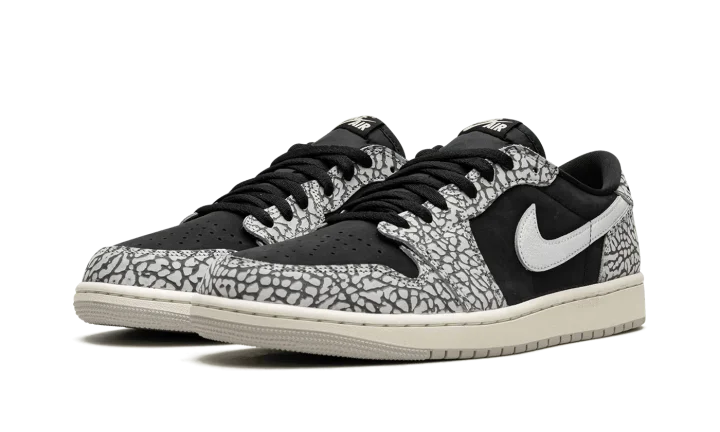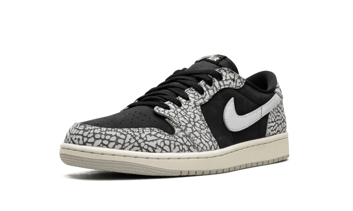 The Women's Air Jordan 1 Low OG "Elephant Print" is the women's sizing for the colorway of the vintage basketball shoe that incorporates a classic patterning of the Air Jordan 3. This "Elephant Print" iteration of the Jordan 1 Low OG nods to the Air Jordan 3 by featuring its iconic pattern across the upper. The shoe's base is designed in black leather. A white leather Swoosh is found on either side. Classic "Wings" and "Nike Air" logos appear on the heel and tongue tag, respectively. Release date: June 23, 2023