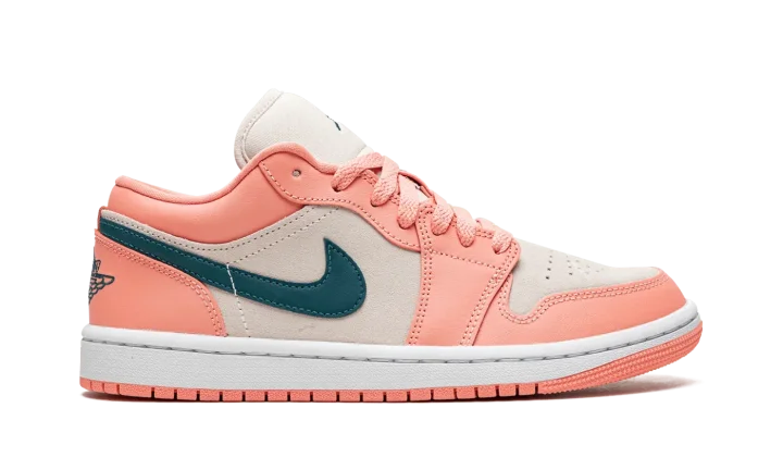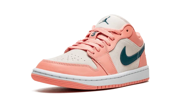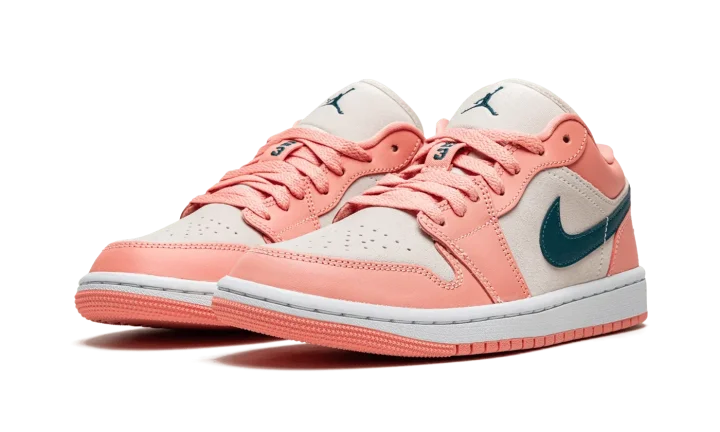 The Women's Air Jordan 1 Low "Light Madder Root" is a women's release of the retro basketball and lifestyle shoe in a fun, colorful look. The "Light Madder Root" combines pink leather overlays with a Light Madder Root, or tan, suede base. A Dark Teal Green leather Swoosh is found on either side of the shoe. The dark green hue also appears on the "Wings" branding embroidered on the heel, the Jumpman on the tongue, and the "23" detailing on the lace overlay. Pink laces, a white midsole, and a pink rubber outsole put the finishing touches on the look.
