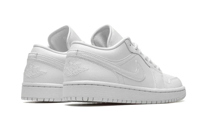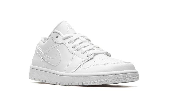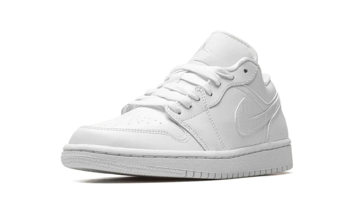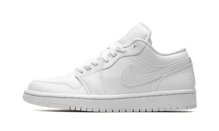 The Women's Air Jordan 1 Low "Triple White" is the women's sizing of the monochromatic colorway of the retro basketball shoe. Michael Jordan's first signature shoe, the Air Jordan 1 is one of the greatest sneakers of all time, and on the "Triple White" Jordan 1 Low, one of the most versatile, too. The shoe has an all-white leather upper with a white leather base and tonal leather overlays. A white leather Swoosh appears on either side. White "Wings" branding is embroidered on the heel and a white Jumpman is stitched onto the tongue. Underfoot, a white rubber sole completes the look.