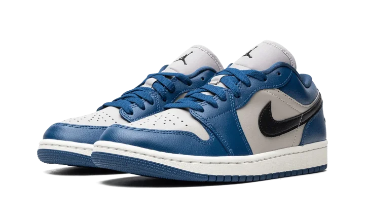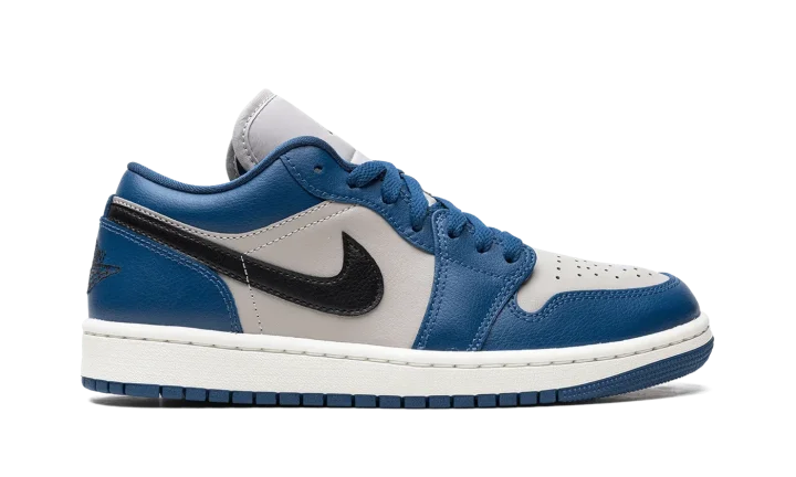 The Women's Air Jordan 1 Low "French Blue" is a women's-exclusive colorway of the classic sneaker with a timeless color block. The "French Blue" features a College Grey leather base with French Blue leather overlay panels. A black Swoosh appears on the mid-panel and classic "Wings" branding is embroidered on the heel. Black Jumpman detailing is stitched onto the grey nylon tongue. A white rubber midsole and French Blue rubber outsole complete the look. Release date: August 31, 2023