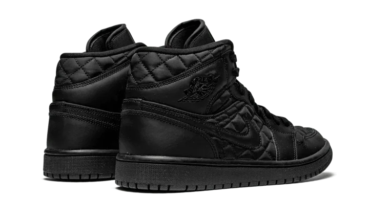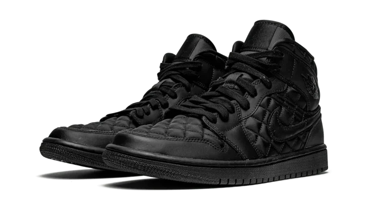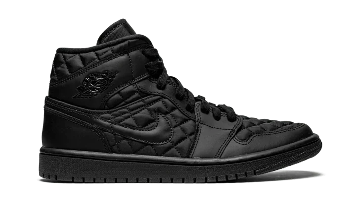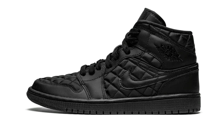 The Women's Air Jordan 1 Mid Quilted "Black" is a premium look for the women's version of Michael Jordan's first signature shoe that features a quilted upper. While not the first monochromatic black Air Jordan 1, the aptly named "Black" is in fact the first variation of the model to display an all-black quilted appearance. Plush black quilted nylon appears on the toe, mid-panel, and collar. Smooth tonal leather graces the forefoot, eyelets, collar, and heel. A black leather Swoosh can be found on either side and a black "Wings" logo is situated on the collar. A black Jumpman and "Air" logo are printed on the tonal nylon tongue tag on the black nylon tongue. The shadowy vibe is complete with black laces and a black rubber sole. Release date: January 5, 2021
