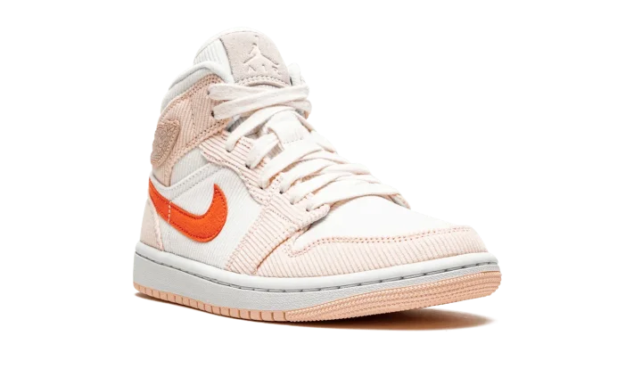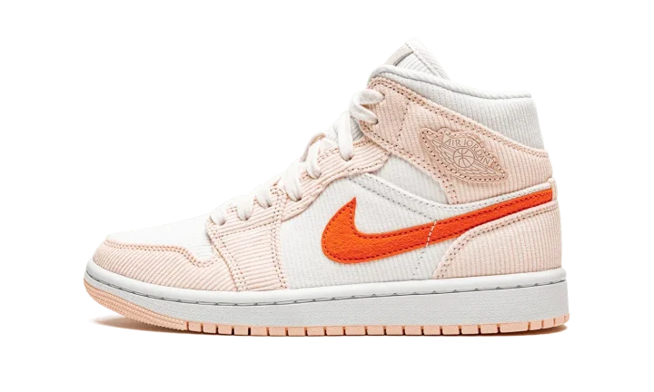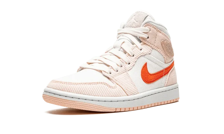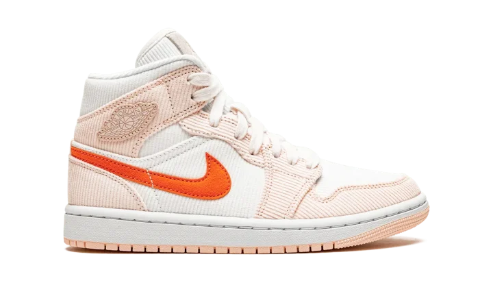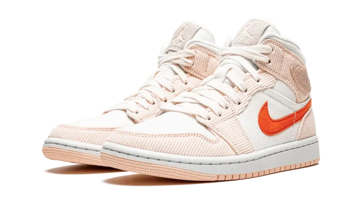 The Women's Air Jordan 1 Mid SE "Corduroy" is a redesigned look for the women's version of the mid-top shoe that replaces the model's original leather design with plush corduroy. A fresh look for the summer months and beyond, the "Corduroy" updates the look of the popular Jordan 1 Mid with a soft-to-the-touch Sail-colored corduroy material on the toe, mid-panel, and collar. Orange Quartz corduroy panels contrast the look and a bright orange suede Swoosh is found on either side. Additional branding efforts include a tonal "Wings" patch on the collar and embossed Jumpman and "Air" insignias on the suede tongue tag. Sail laces sit on a corduroy tongue to round out the look.