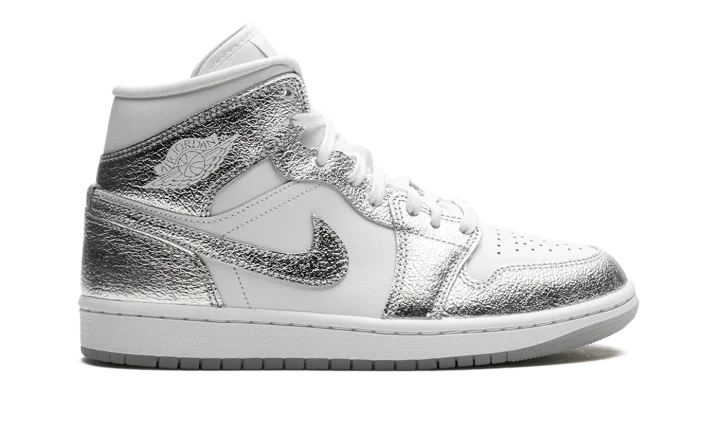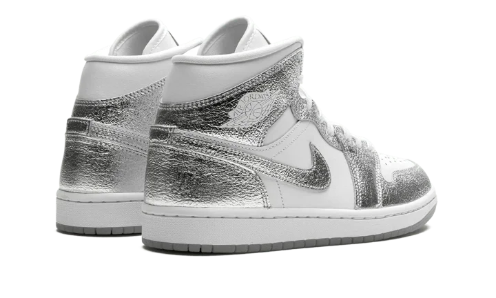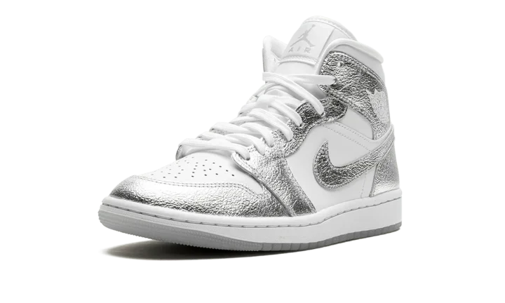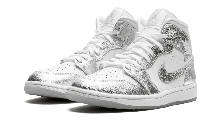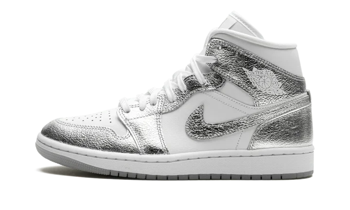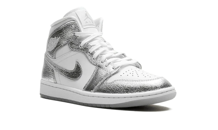 The Women's Air Jordan 1 Mid SE "Metallic Silver" is a women's-exclusive colorway of the casual shoe with flashy Metallic Silver accents. The Jordan 1 Mid seen here is complete with a white leather upper and Metallic Silver leather overlays that draw attention to the shoe with ease. A Metallic Silver Swoosh appears on the sides, while a "Wings" logo can be seen on the collar. Classic Jumpman branding appears on the tongue. Underfoot, a white rubber midsole and an icy blue translucent rubber outsole complete the look. Release date: March 20, 2024
