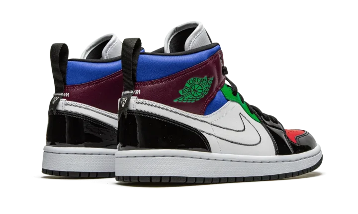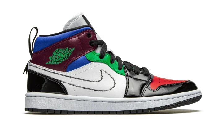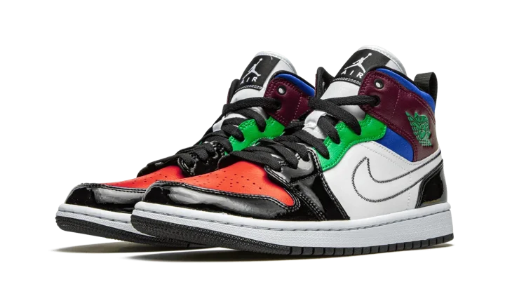 The Women's Air Jordan 1 Mid SE "Multicolor" introduces a mismatched colorway to the iconic Air Jordan collection on the women's sizing of Michael Jordan's first signature shoe. The abstract "Multicolor" Jordan 1 Mid follows a similar design ethos to that of the "Patent Leather Multicolor" colorway of the same shoe. A burgundy leather overlay with green "Wings" branding appears on top of the blue leather base of the collar. The perforated toe features vibrant University Red leather and kelly green leather can be found on the middle segment of the eyelets. Glossy black patent leather overlays on the forefoot, bottom eyelet, and heel add balance to the design of the white leather mid-panel. Outline stitched Swoosh branding appears on either side of the Women's Jordan 1 Mid "Multicolor" to complete the look.