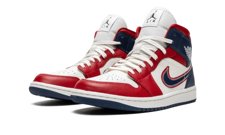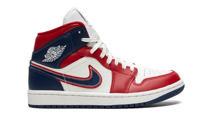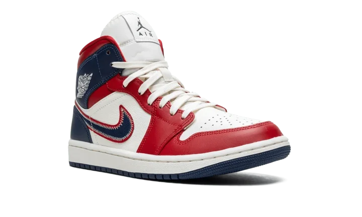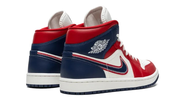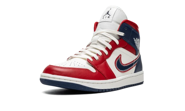 The Women's Air Jordan 1 Mid SE "USA" is a women's-exclusive release of the popular lifestyle shoe in a red, white and blue colorway with a patriotic flair. The upper features a Sail (cream white) leather base with Gym Red-colored leather on the toe cap, forefoot, eyelets, and collar. The heel and collar are designed in Midnight Navy leather. A navy Swoosh with a red border and white contrast stitching is found on either side of the shoe and a classic "Wings" logo appears on the collar. Cream laces are layered over the white nylon tongue.
