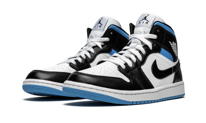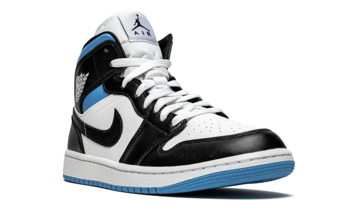 The Women's Air Jordan 1 Mid "Black/White/University Blue" is a women's exclusive version of Michael Jordan's first signature shoe in a versatile colorway. In mid-top form, the "Black/White/University Blue" features white leather on the perforated toe and mid-panel. The forefoot, eyelets, collar, heel, and Swoosh are dressed in black leather. A white "Wings" graphic appears on the black leather overlay above the University Blue collar and a black Jumpman and "Air" logo can be found on the white nylon tongue tag. Underfoot, a white rubber midsole and contrasting University Blue outsole complete the look.