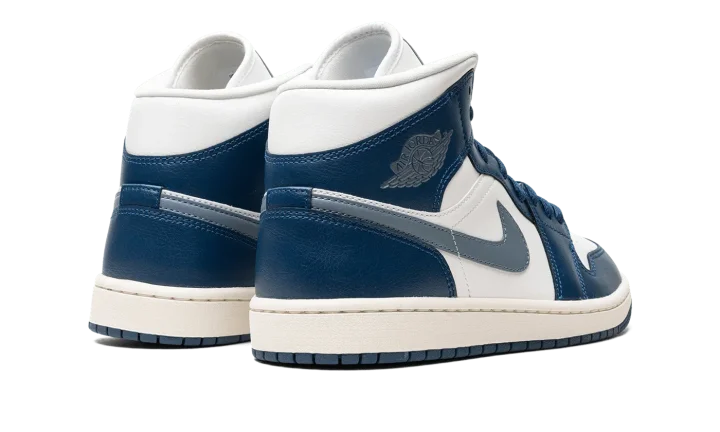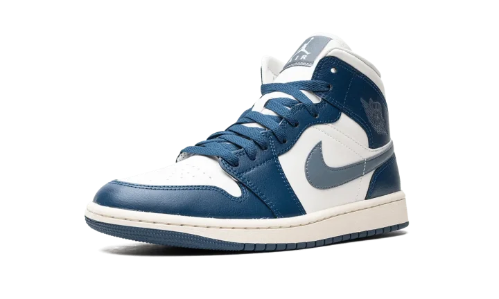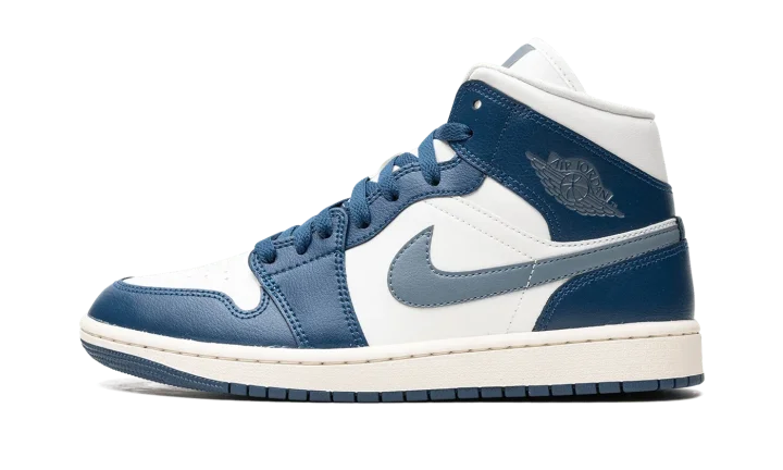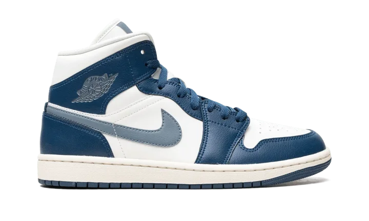 The Women's Air Jordan 1 Mid "French Blue" is a women's-exclusive colorway of lifestyle shoe with an appealing color block. The upper features a Sail (off-white) leather base with French Blue leather overlay panels. An Ozone Blue leather Swoosh appears on both sides. A grey "Wings" logo can be found on the collar overlay while a white Jumpman is seen on the grey nylon tongue tag. Underfoot, a Sail rubber midsole and French Blue outsole complete the clean look. Release date: August 31, 2023