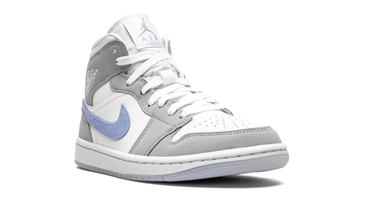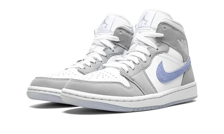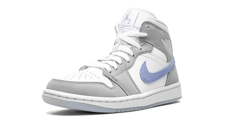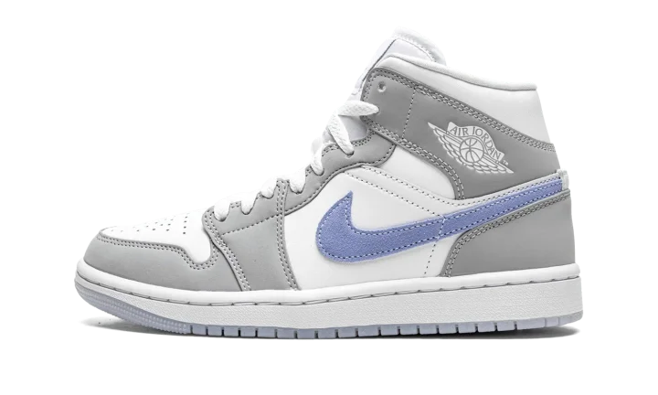 The Women's Air Jordan 1 Mid "Wolf Grey/Aluminum" is a women's exclusive look for Michael Jordan's iconic first signature shoe. Interestingly, the "Wolf Grey/Aluminum" colorway is reminiscent of the white-and-grey color block of the Dior x Air Jordan 1 from 2020, one of the most coveted Air Jordan releases of all time. Like Dior's high fashion-inflicted take on the retro basketball shoe, the "Wolf Grey/Aluminum" features white leather on the perforated toe, mid-panel, and collar. Contrasting grey leather detailing highlights the look of the forefoot, eyelets, collar, and heel. Unlike the Dior x Air Jordan 1, the "Wolf Grey/Aluminum" is constructed with a blue suede Swoosh on either side. A white "Wings" graphic adorns the collar and a low-contrast, grey Jumpman logo sits above "Air" branding on the white nylon tongue.