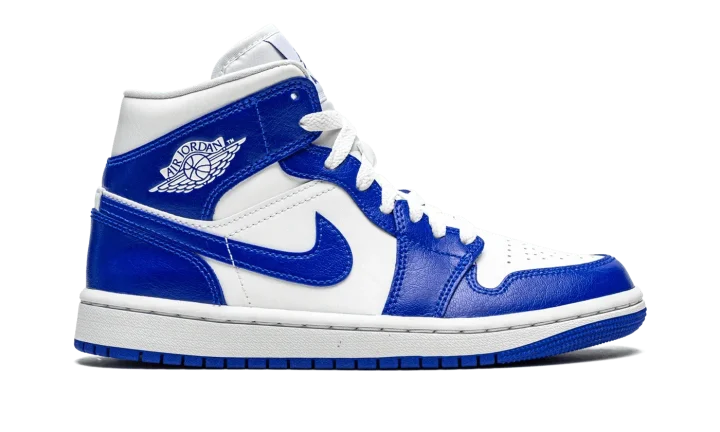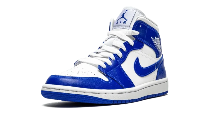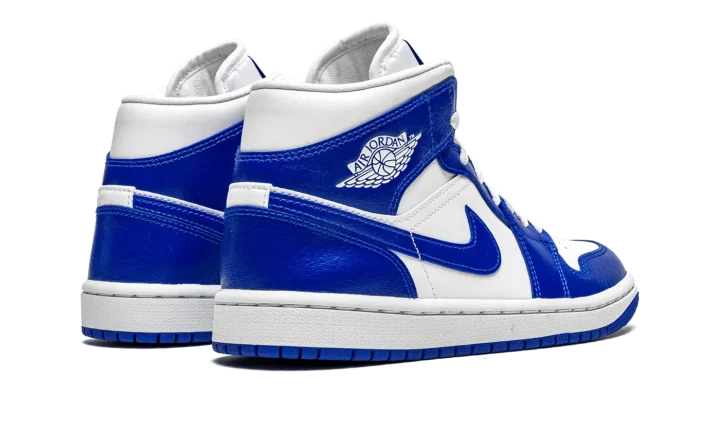 The Women's Air Jordan 1 Mid "Kentucky Blue" is the women's sizing of Michael Jordan's first signature shoe in a colorway that nods to the color block of the Nike Dunk's original "Kentucky" style. Nearly identical to the appearance of the retro "Kentucky" colorway from 1985's "Be True to Your School" collection of college basketball inspired Dunks, the Jordan 1 Mid "Kentucky Blue" features a white leather base with contrasting Hyper Royal leather overlays and Swoosh branding. A classic white "Wings" logo appears on the collar. Blue Jumpman and "Air" detailing is found on the tongue tag located on the white nylon tongue. Jordan Brand completes this college basketball-flavored Jordan 1 Mid for women with a white midsole and blue rubber outsole.