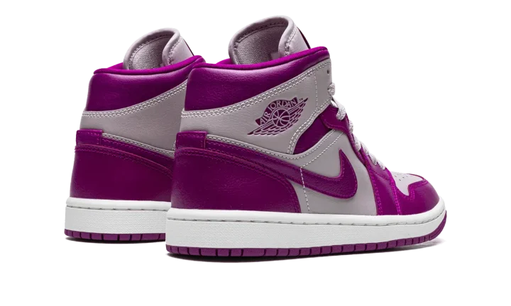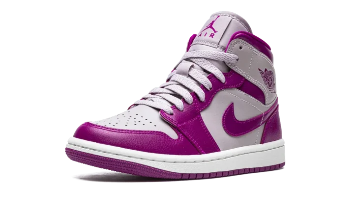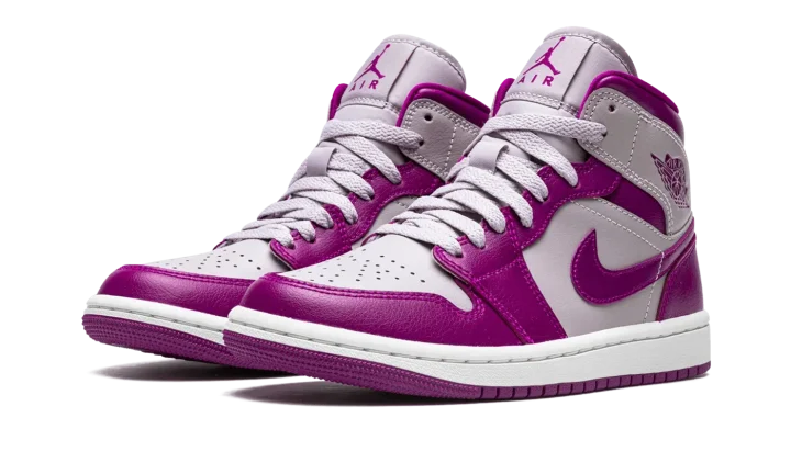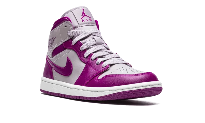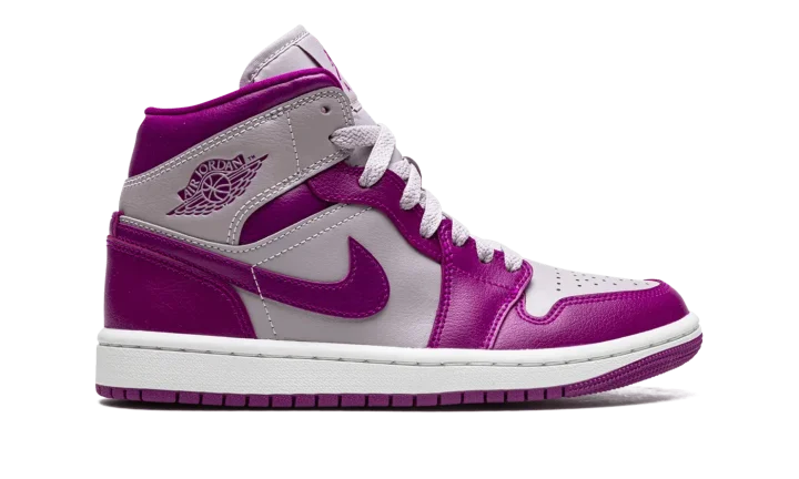 The Women's Air Jordan 1 Mid "Magenta" is a women's-exclusive colorway of the popular mid-top silhouette from Jordan Brand's Spring 2022 lineup. The "Magenta" borrows inspiration from the two-tone appearance of many classic Nike Dunk colorways, as it features violet and magenta color combination on its panels. Specifically, the perforated toe, mid-panel, and collar are designed in light purple leather. The toe cap, forefoot, eyelets, heel, and Swoosh appear in magenta leather. The dark purple hue also appears on the "Wings" logo on the collar, and on the Jumpman and "Air" branding on the tongue tag. The shoe is finished off with a white midsole and magenta rubber outsole.