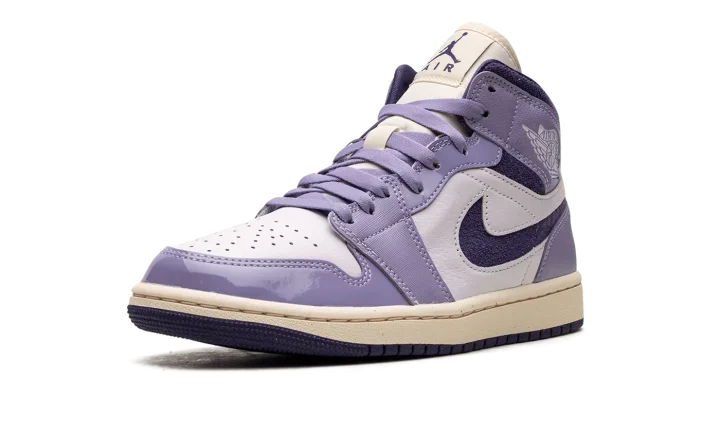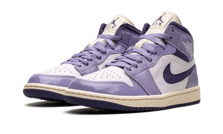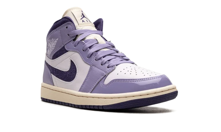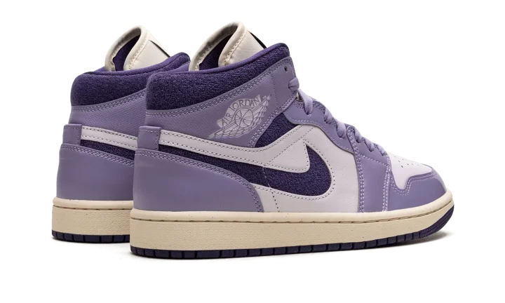 The Women's Air Jordan 1 Mid "Sky J Purple" is a women's-exclusive colorway of the lifestyle shoe with a warm weather look. This can't-miss colorway features a Sky J Purple, Barely Grape, and Guava Ice color block with a textile material in purple on the collar and inside the cut-out Swoosh that appears on each side. Classic Jumpman and "Air" branding is seen on the tongue. Underfoot, an aged midsole completes the look. Release date: July 20, 2023