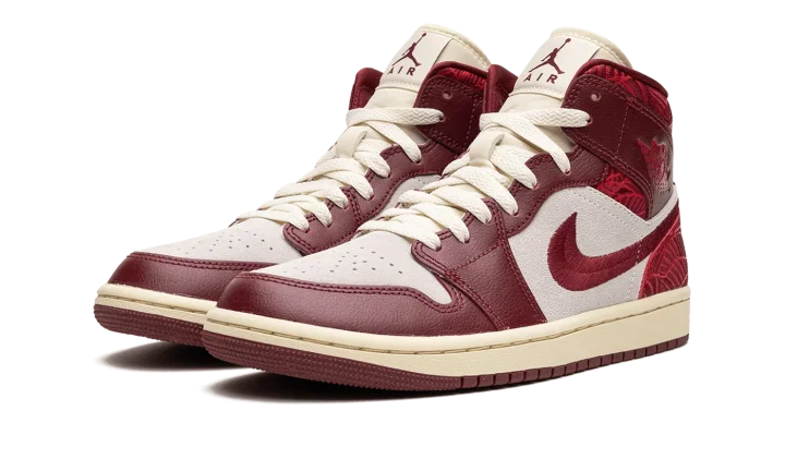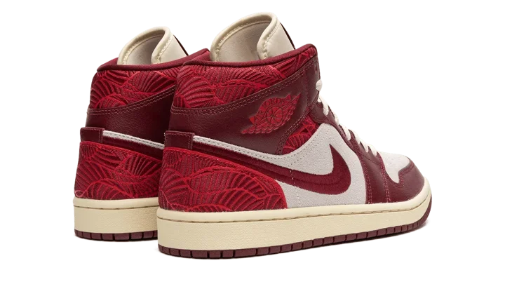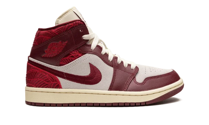 The Women's Air Jordan 1 Mid "Tiki Leaf" is a women's-exclusive colorway of the lifestyle shoe with tropical-inspired detailing. The always popular Jordan 1 Mid receives a warm weather inspired design on the "Tiki Leaf" colorway. The shoe features a Sail suede base with contrasting red leather overlays. A red Swoosh is embroidered on the sides and a red "Wings" logo can be found on the collar. Additional red branding appears in the form of Jumpman and "Air" logos on the tongue tag. The red leather overlays on the collar and heel are treated with a tonal tiki leaf pattern. Release date: March 1, 2023
