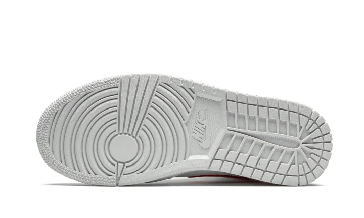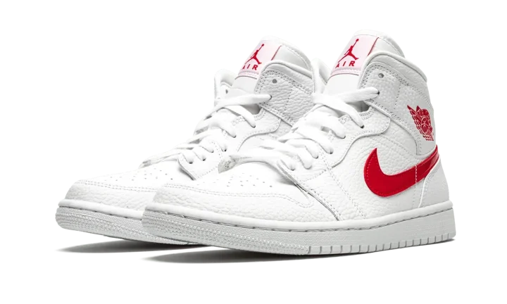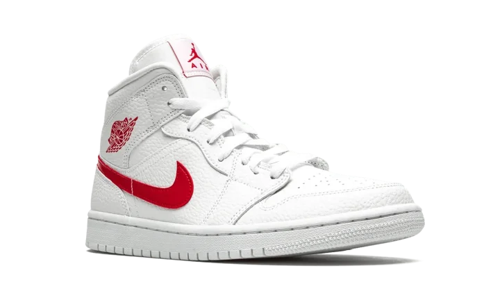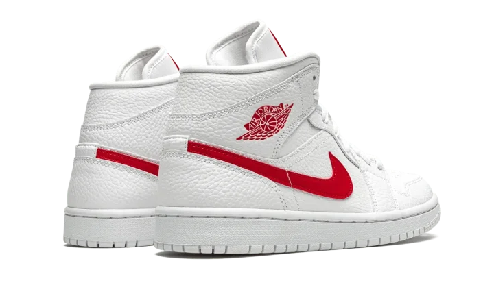 The Women's Air Jordan 1 Mid "University Red" is the women's sizing of Michael Jordan's first signature shoe trimmed down to mid-top height in a crisp new colorway. The upper features all-over white tumbled leather construction, including the perforated toe, mid-panel, collar, and heel. The red leather Swoosh on the mid-panel and "Wings" detailing on the collar adds a burst of color against the muted base of the shoe. University Red Jumpman branding dots the white nylon tongue tab which is sewn onto the white nylon tongue.