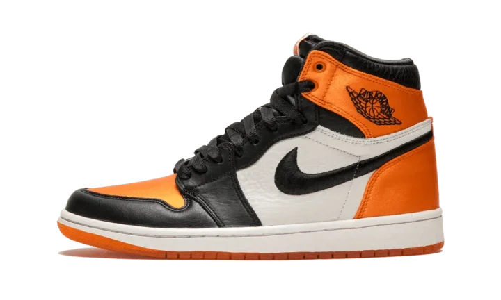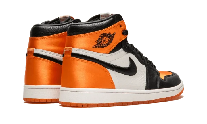 The third installment of "Satin" Air Jordan 1s, this "Shattered Backboard" edition released exclusively for women in May 2018. While the uppers on the previous "Bred" and "Royal" editions were constructed entirely in satin, this version incorporates leather paneling into the upper and blends it with orange satin on the toe and heel. The orange, black, and white "Shattered Backboard" colors look even more striking with this unique fabrication.