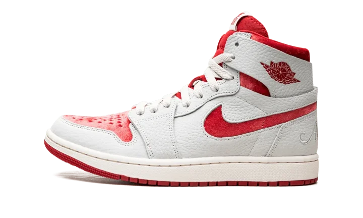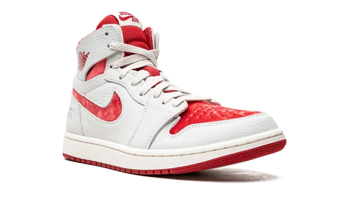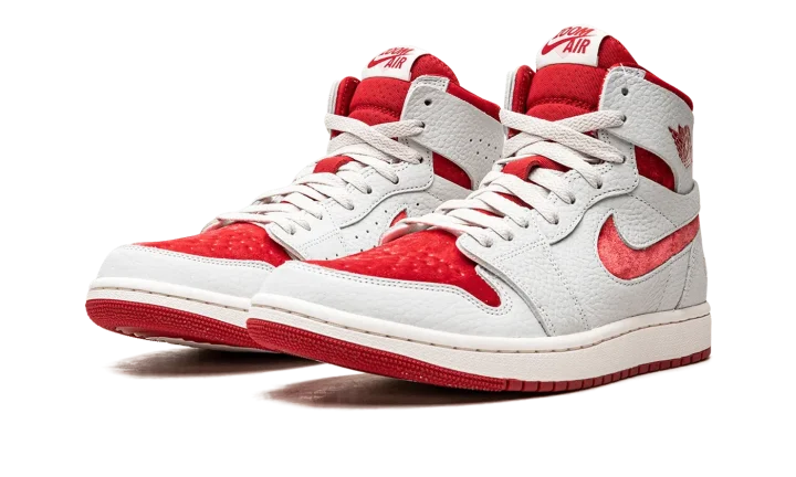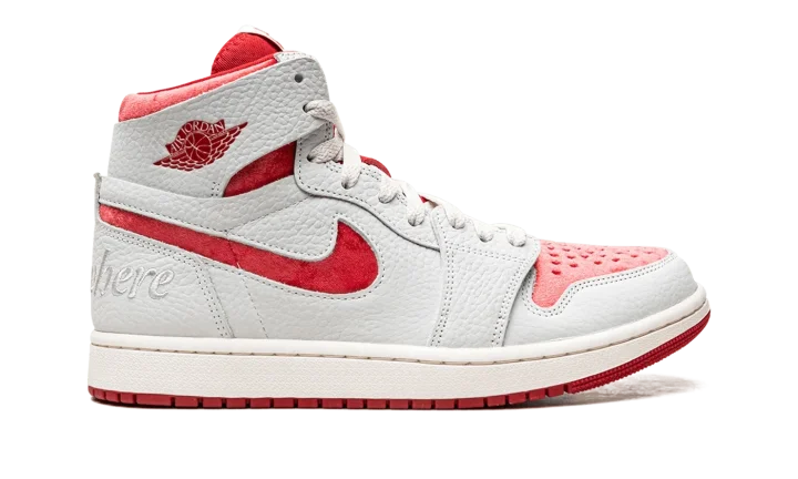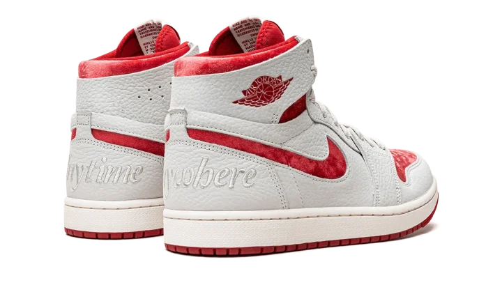 The Women's Air Jordan 1 Zoom CMFT "Valentine's Day" is the modified version of the Jordan 1 inspired by the February holiday. The Air Jordan 1 Zoom Comfort 2 is the second variation of the model that updates the Jordan 1 with a modern design that includes unique panel shapes and Nike's Zoom Air cushioning technology in the midsole. On the "Valentine's Day" colorway, the shoe features red velvet on the toe box and collar, and on the cut-out Swoosh. Additional red accenting is found on the "Wings" branding on the collar and on the "Zoom Air" detailing on the tongue tag. The phrases, "Anytime" and "Anywhere" are embroidered on the heel of the left and right shoes, respectively. Release date: February 9, 2023