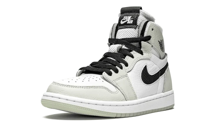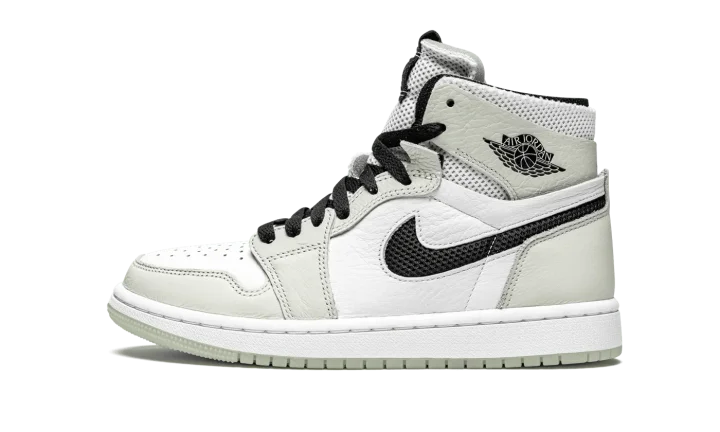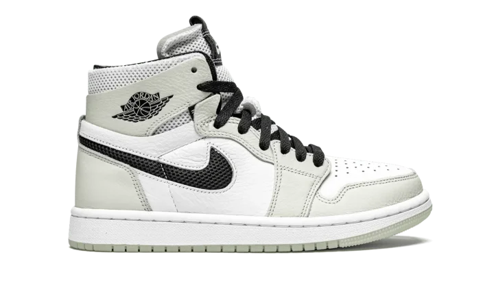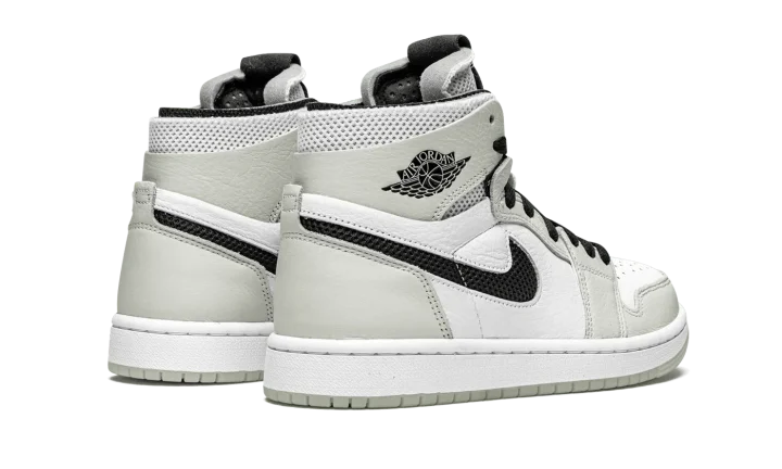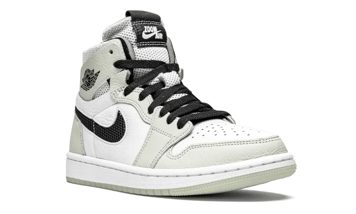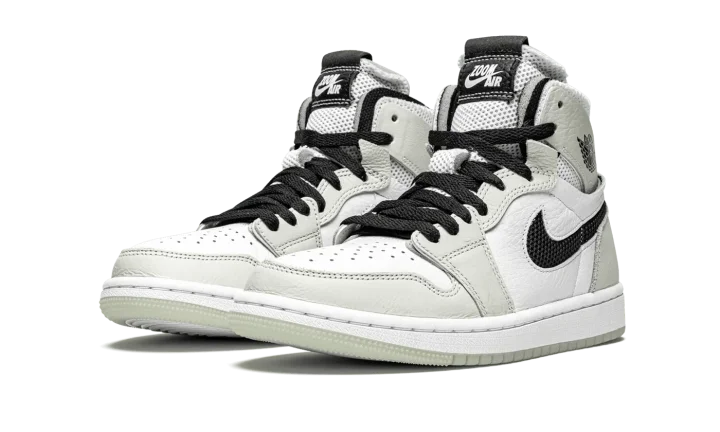 The Women's Air Jordan 1 High Zoom CMFT "Light Bone" is a women's exclusive colorway of the modern interpretation of Michael Jordan's first signature shoe by Jordan Brand. Introduced in 2020, the Air Jordan 1 Zoom Comfort presents a new vision of the iconic retro basketball and lifestyle shoe that includes even more padding around the collar, Zoom Air technology in the sole, and a modern "do-it-yourself" design that includes exposed foam padding and rough-cut overlays. White tumbled leather graces the perforated toe and mid-panel. A low-contrast of White Bone leather appears on the forefoot, eyelets, collar, and heel. Black mesh resides in the cut-out negative space of the Swoosh on either side. Both the collar and tongue are constructed from white mesh for excellent breathability. White "Zoom Air" branding is printed on the black leather tongue tag to signify the model's updated cushioning system underfoot. The new technology replaces the standard Air unit found in the original Air Jordan 1 High OG model.