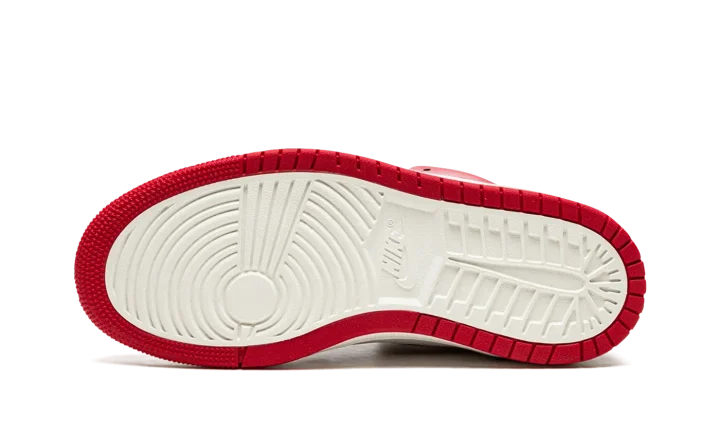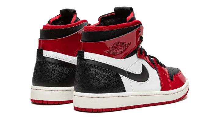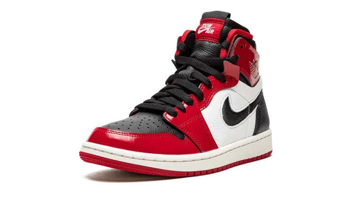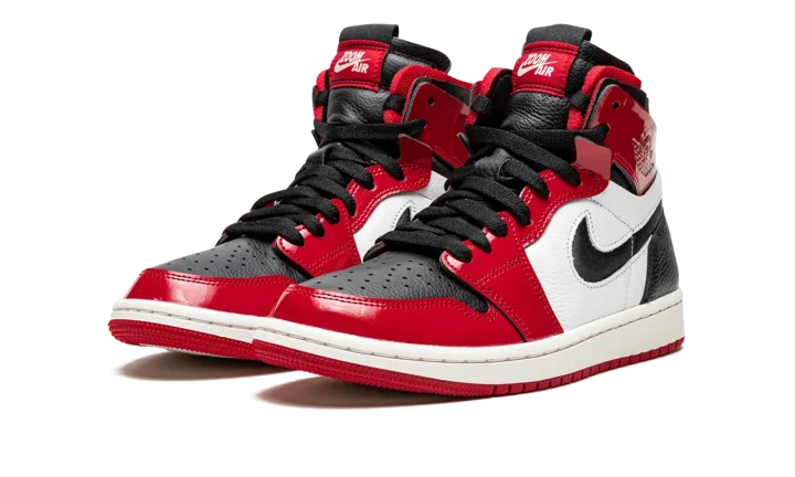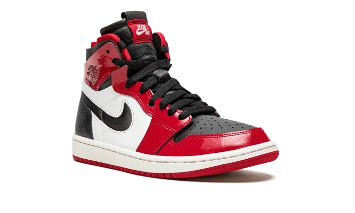 The Women's Air Jordan 1 High Zoom CMFT "Patent Chicago" is a women's-exclusive colorway of the alternate, modernized version of the classic basketball shoe that pays tribute to the Chicago Bulls. Yet another popular colorway that honors Michael Jordan's former basketball team, the "Patent Chicago" edition of the Jordan 1 High Zoom Comfort features a unique combination of materials to tell its story. The toe cap, forefoot, eyelets, and collar are all designed in red patent leather. The mid-panel is constructed from white leather and the perforated toe is featured in black leather. Black leather also appears on the heel. A cut-out black Swoosh is located on both sides of the shoe and a black outline "Wings" logo is found on the collar. A "Zoom Air" logo appears on the red nylon tongue tag. Underfoot, Nike's Zoom Air cushioning is encased within the midsole for additional comfort. Release date: April 28, 2022