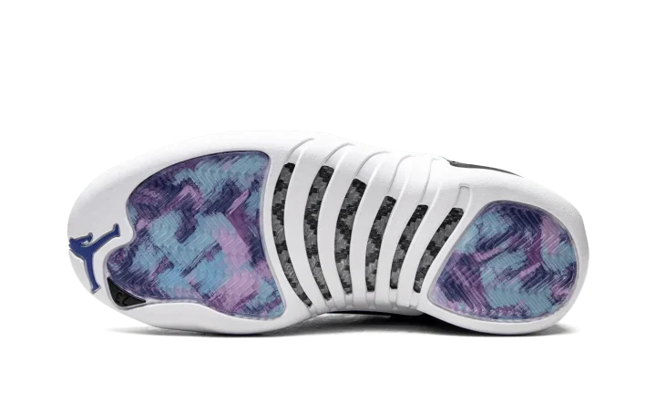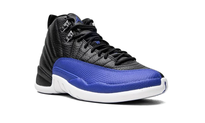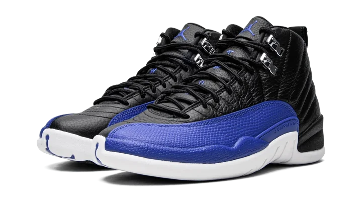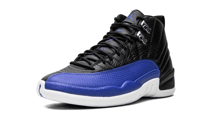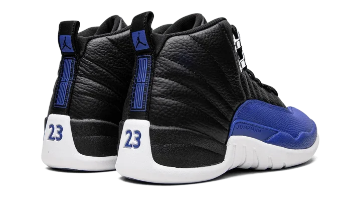 The Women's Air Jordan 12 "Hyper Royal" is a women's-exclusive colorway of the retro basketball shoe that was released in October 2022. The "Hyper Royal" draws loose inspiration from the Jordan 12 "Flu Game" and "Playoffs" as it features a black tumbled leather upper with a contrasting mudguard. On the "Hyper Royal," the model's signature basketball-textured mudguard appears in royal blue. Additional Hyper Royal accenting includes a royal Jumpman logo and "Two 3" branding on the tongue, "23" detailing on the back of the midsole, and Jumpman and "Celebrating 25 Years of Jordan in China" insignia on the heel. Metallic Silver eyelets and blue Jumpman branding on the outsole complete the look. Release date: October 1, 2022