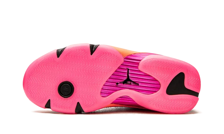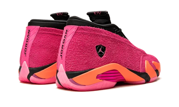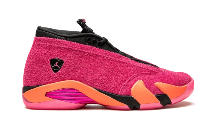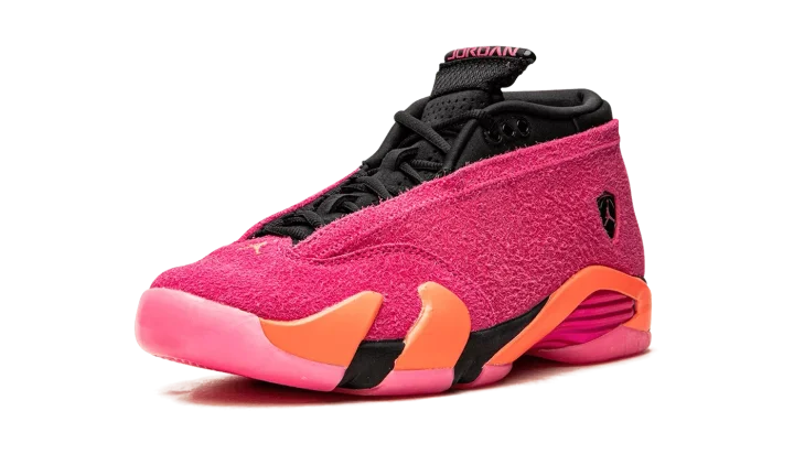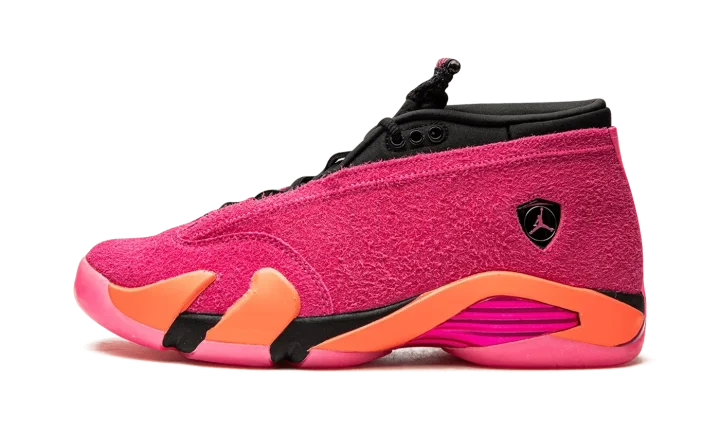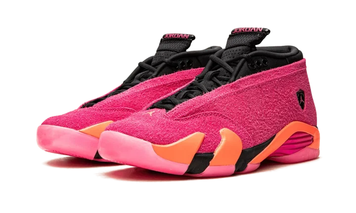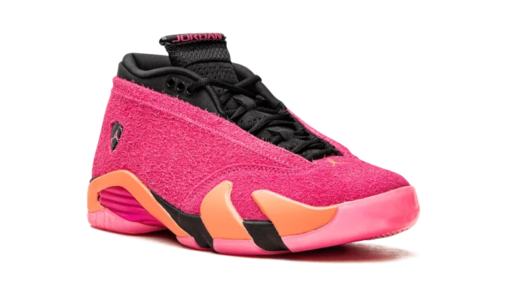 The Women's Air Jordan 14 "Shocking Pink" is a Holiday 2021 release of Michael Jordan's fourteenth signature shoe in a head-turning, women's-exclusive colorway. The "Shocking Pink" was released in November 2021 and its design is inspired by Jordan's belief in being boldly and unapologetically yourself. Certainly one of the more eye-catching Jordan 14s of 2021, the upper is designed in shaggy Shocking Pink suede. A Ferrari-inspired Jumpman emblem is found on the collar and "Jordan" branding appears in black lettering on the heel. A small Bright Crimson Jumpman is embroidered on the toe. Black laces are layered over the tonal mesh tongue with pink "Jordan" branding. Additional Bright Crimson accenting is found on the midsole. Release date: November 4, 2021