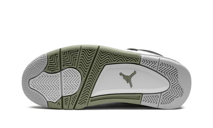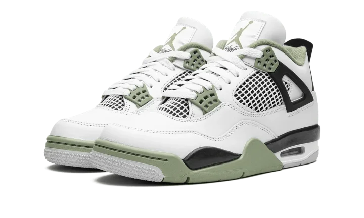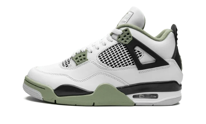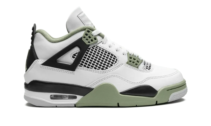The Women's Air Jordan 4 "Oil Green" is a women's-exclusive colorway of the classic sneaker that adds to its impressive collection of releases. In the "Oil Green" colorway, this Jordan 4 is complete with a white leather construction with tonal netting on the tongue and mid-panel. Seafoam-colored eyelets are found on the sides of the shoe and additional Seafoam accenting appears on the Jumpman on the tongue and on the heel. The minty-green hue is also on the interior collar and on the rubber overlay on the toe and forefoot on the outsole. A visible Air bubble appears in the heel of the midsole. Release date: February 9, 2023
