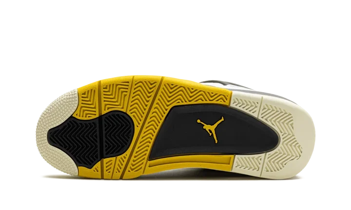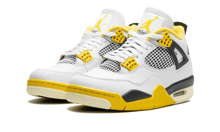 The Air Jordan 4 "Vivid Sulfur" is a colorway of Michael Jordan's fourth signature shoe with yellow accents. Released in celebration of the Jordan 4's 35th anniversary in 2024, the "Vivid Sulfur" features a white leather upper with black "wings" and a black underlay beneath the white netting on the mid-panel and tongue. Vivid Sulfur accenting appears on the eyelet tabs, the Jumpman on the tongue, the inner lining, and on the midsole. More Vivid Sulfur detailing appears on the Jumpman on the black heel counter. Underfoot, a visible Air unit in the heel of the midsole completes the look. Release date: April 6, 2024