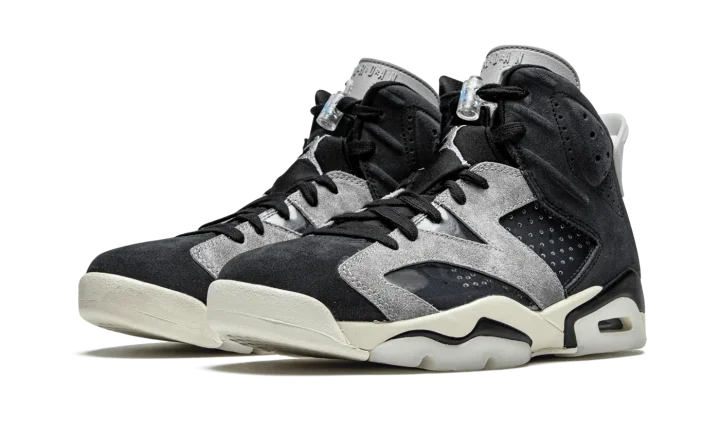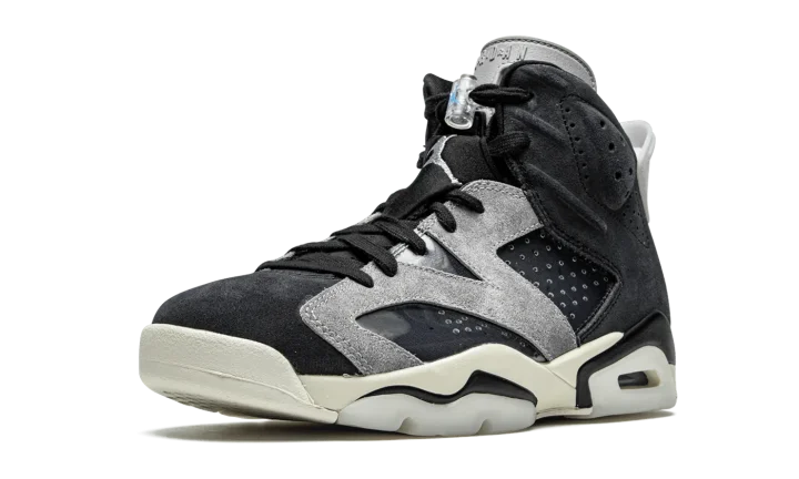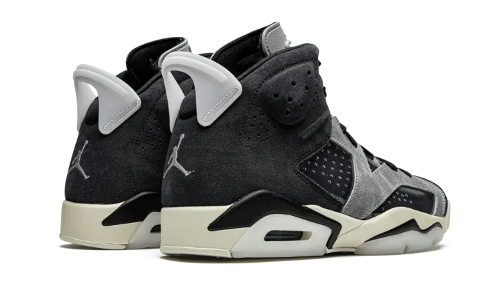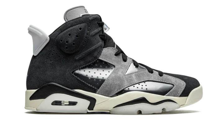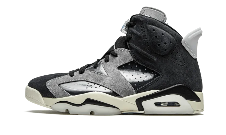 The Women's Air Jordan 6 "Tech Chrome" AKA "Smoke Grey" is the women's sizing of Michael Jordan's sixth signature model in a neutral colorway for unlimited versatility. Reimagined by Jordan Brand for its Fall 2020 campaign, this "Tech Chrome" Jordan 6 is another lifestyle-focused shoe that appeals to fans of His Airness, as well as those who simply appreciate the classic styling of Air Jordans. The upper displays a mixture of colors and materials, including a Light Smoke Grey suede overlay atop the shiny black perforated leather mid-panel. Charcoal suede dots the toe, collar, and heel. A white "spoiler" heel tab and tonal Jumpman detailing on the neutral colored nylon tongue add to the shadowy aesthetic. Inspirational slogans like "Be Kind," "Embrace Uniqueness," and "Spread Love" are printed on the sockliner. The visible Air window in the heel is surrounded by translucent molding for a classic yet modern appearance. Release date: September 24, 2020.