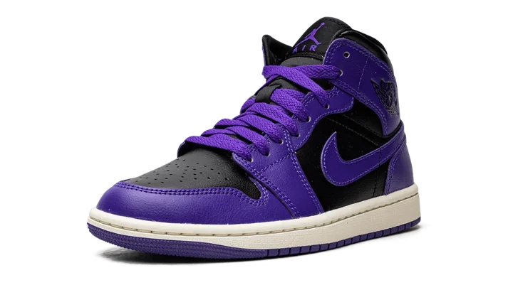 The Women's Air Jordan 1 Mid "Black/Purple" is a women's-exclusive colorway of the popular lifestyle shoe in a two-tone, purple and black design. A head-turning look for the Jordan 1 Mid, the "Black/Purple" features a black leather base with contrasting Concord-colored leather overlays and Swoosh branding. A black "Wings" logo appears on the collar while a purple Jumpman is found on the tongue tag. Underfoot, the shoe is complete with a Sail rubber midsole that gives the shoe a vintage look and a Concord outsole. Release date: August 27, 2022
