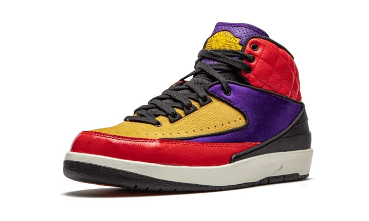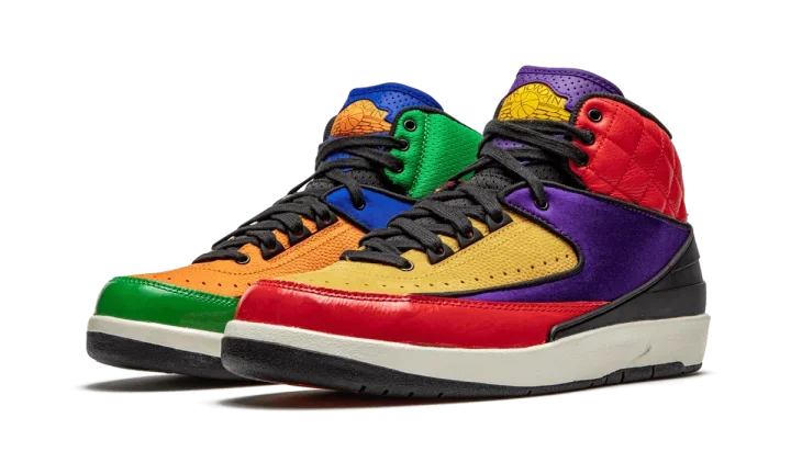 The Women's Air Jordan 2 "Multicolor" is a special colorway of Michael Jordan's second signature shoe in an eye-catching multi-color and multi-texture construction. Drawing from the model's ties to luxury, Jordan Brand finishes the upper in mismatching panels in a myriad of colors and contrasting materials. The collar features a quilted leather finish while pebbled leather adorns the forefoot, nylon covers the mid-panel, and shiny patent leather highlights the toe cap. The eccentric design is pulled together by a synthetic black heel molding. The dotted leather tongue features a contrasting color pattern that continues onto the Wings branding. The Women's Air Jordan 2 "Multicolor" was released on March 5, 2020.