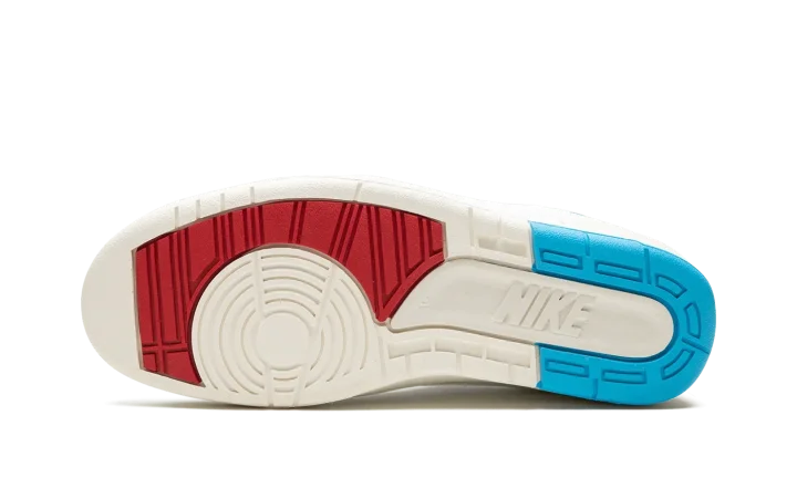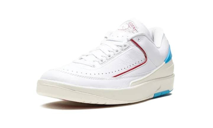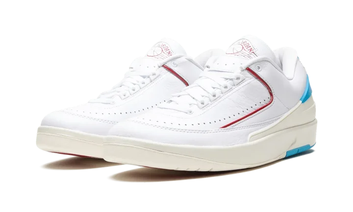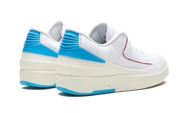 The Women's Air Jordan 2 "UNC to Chicago" is a women's-exclusive colorway of Michael Jordan's second signature shoe that shows appreciation for his two former basketball teams. Originally appearing on the Air Jordan 1, the "UNC to Chicago" theme makes its way onto the Jordan 2 Low as part of the vintage basketball shoe's comeback in 2022 and 2023. The design features the familiar color schemes of both the North Carolina Tar Heels and the Chicago Bulls, Jordan's college and professional basketball teams. The shoe features a white leather construction with contrasting University Blue accenting on the heel, which is a nod to the Tar Heels. Fiery red detailing inspired by the Bulls' primary team uniform color is found on the underlay on either side of the shoe. Red "Wings" branding appears on the tongue. The cream accenting on the back of the shoe and on the mid-panel gives the design a decidedly aged look. Release date: March 8, 2023