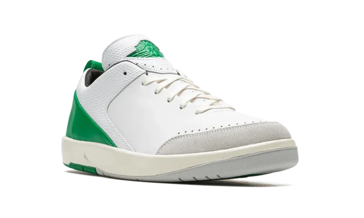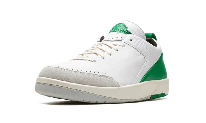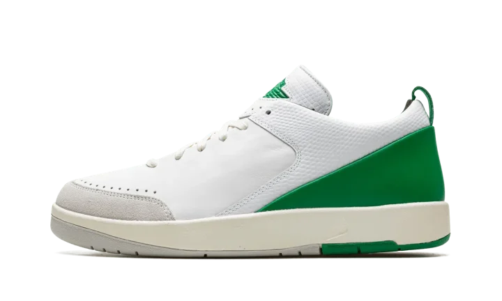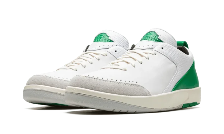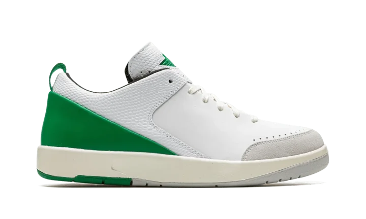 The Nina Chanel Abney x Women's Air Jordan 2 Low "White Malachite" is a collaboration between the popular contemporary artist and Jordan Brand on an elegant colorway of Michael Jordan's second signature shoe. The Jordan 2 was brought back from the vault in late 2021 when Off-White collaborated with Jordan Brand on two retro-inspired colorways. The model was then included in several other high-profile projects, including with the likes of Union and Nina Chanel Abney. Here, Nina's take on the Jordan 2 pushes forward a vintage-luxury look. Specifically, the upper features a white leather base with tonal faux reptile print overlays and grey suede on the toe. Contrasting green leather is found on the heel, on the pull tab, and on the "Wings" logo on the tongue. Giving the shoe a decidedly vintage look, the laces and midsole are rendered in cream. Release date: July 8, 2022