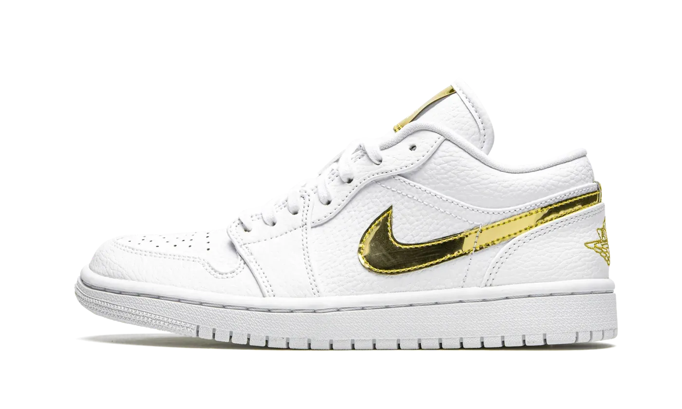 The Women's Air Jordan 1 Low "White/Metallic Gold" is Michael Jordan's first signature shoe in its low-top height dressed in a luxurious color scheme. Over time, the Jordan 1 Low has become known for its selection of lifestyle focused colorways, and this "White/Metallic Gold" look is no exception. The entire upper is covered in white tumbled leather, including the perforated toe, mid-panel, collar, and heel. Metallic Gold Swooshes on either side bring a premium look to the shoe. Additional gold detailing can be found on the embroidered "Wings" logo on the heel, and on the metallic tongue tab with white Jumpman insignia. Tonal shoelaces and white "23" embroidery on the lace cover complete the look of this crisp Jordan 1 Low in women's sizing.