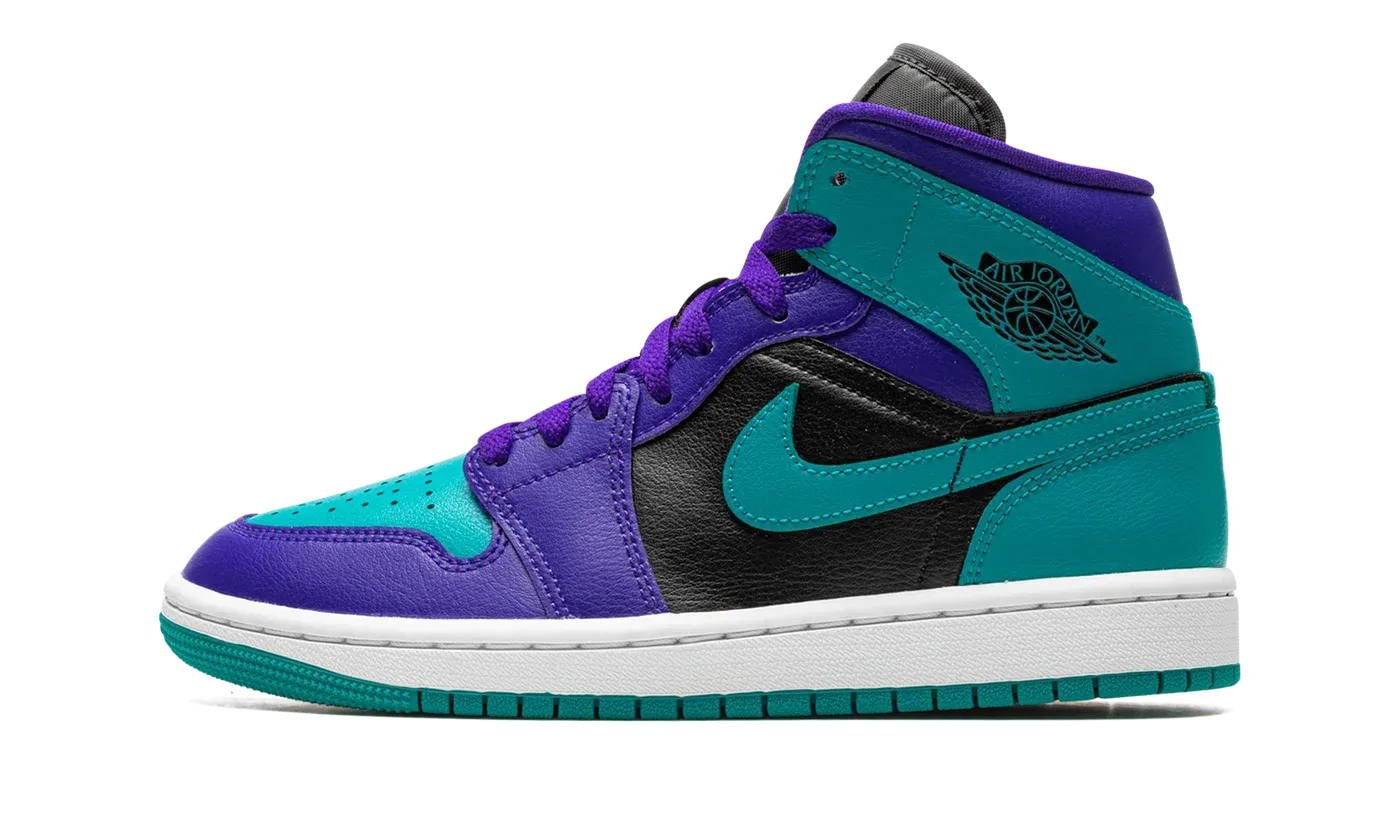 The Women's Air Jordan 1 Mid "Black Grape" is a women's-exclusive colorway of the lifestyle shoe that unofficially nods to the Charlotte Hornets. Dubbed the "Black Grape," this eye-catching Jordan 1 Mid features teal and purple accents that call to mind the team uniform colors of the NBA basketball team. Specifically, the shoe is complete with New Emerald-colored leather on its perforated toe, collar, heel, and Swoosh. Contrasting Grape leather is found on the toe cap, forefoot, collar, and laces. A black "Wings" logo appears on the collar overlay and purple Jumpman and "Air" detailing dots the tongue tag.