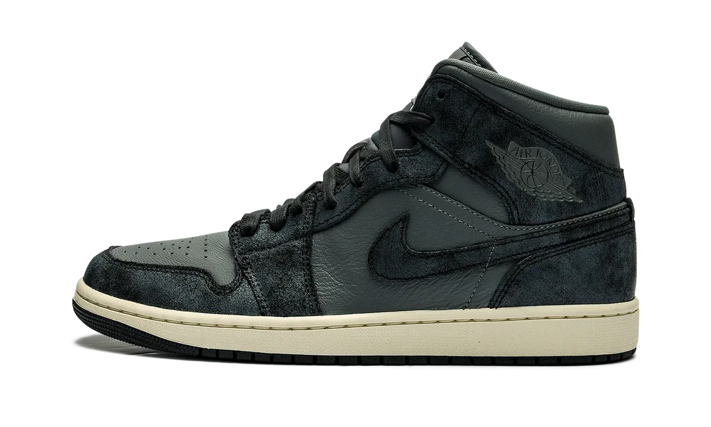 The Women's Air Jordan 1 Mid "Distressed Smoke Grey" is a women's-exclusive colorway of the lifestyle shoe with aged details. The "Distressed Smoke Grey" features a Smoke Grey leather base with Off Noir suede overlays that have a crackled treatment to appear weathered. A grey "Wings" logo appears on the collar, while Jumpman branding is found on the tongue tag. Jordan Brand supplies the shoe with a Sail rubber midsole for a decidedly vintage look. Release date: January 20, 2024