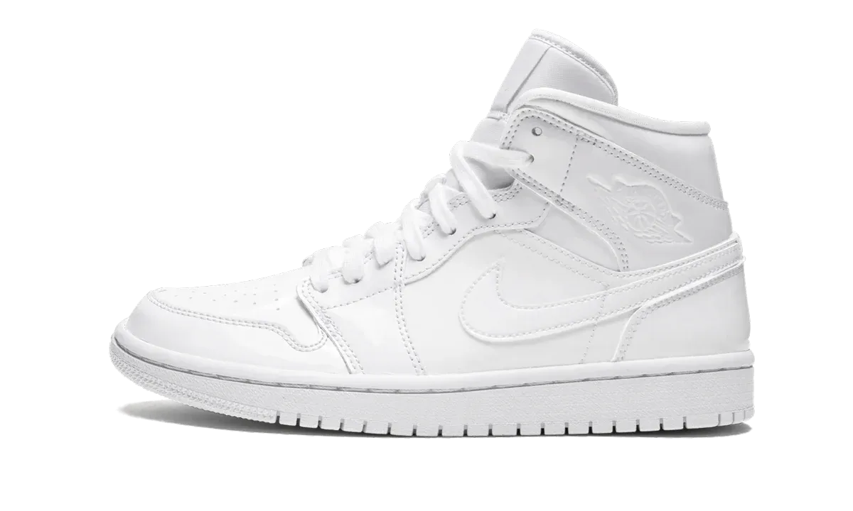 The women's Air Jordan 1 Mid "Triple White Patent Leather" is a crisp and clean edition of the mid-top Air Jordan 1 for women. The Jordan 1 Mid receives a glossy all-white patent leather upper with all other details from the tongue to the rubber sole unit in nothing but white. The embossed "wings" logo and the Jumpman branding on the tongue are tonal to ensure a true "triple white" aesthetic. The women's Air Jordan 1 Mid "Triple White Patent Leather" released in 2018.