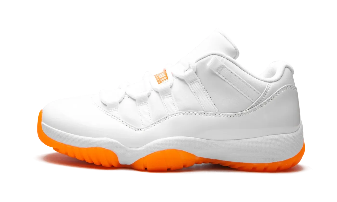 The Women's Air Jordan 11 Low "Bright Citrus" is a women's exclusive colorway of Michael Jordan's eleventh signature shoe that was originally released in 2001. One of the first non-original Air Jordan 11 colorways, the "Bright Citrus," or just "Citrus" as it was referred to upon its debut, was part of Jordan Brand's "Retro+" collection that reimagined core classic Jordan styles as "lifestyle" shoes in new materials and colorways designed to be worn away from the basketball court. The minimalist look of the "Bright Citrus" is highlighted by the design's white patent leather mudguard and white tumbled leather upper. An orange Jumpman is embroidered on the back of the shoe beneath the orange "23" detailing on the heel. An orange nylon Jordan patch can be found in the middle of the design of the white leather tongue. The semi-translucent outsole is finished off in a Bright Citrus hue per the original styling of the women's-exclusive "Citrus" from 2001. What's more, unlike the 2015 release, the May 2021 version of the "Bright Citrus" features the Jordan 11's original carbon fiber support plate on the outsole. Release date: May 6, 2021.