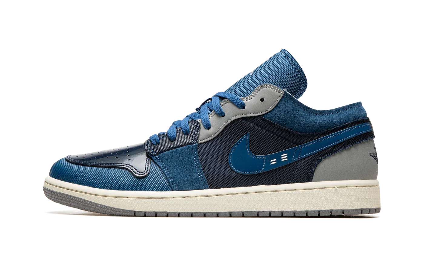 The Air Jordan 1 Low Craft "Obsidian" is a blue-based colorway of the modified version of the low-top shoe made from a unique combination of materials. The "Obsidian" Jordan 1 Low Craft is from a Nike collection of reconstructed "Craft" shoes. Here, the colorway features an upper designed in a mixture of leather, suede, and other textiles in Obsidian hues. Obsidian-colored patent leather is found on the perforated toe. Additional Obsidian accenting appears on the mesh mid-panel and mesh lower eyelet. French Blue detailing lands on the mesh toe cap, on the suede eyelet and suede collar, as well as on the leather Swoosh. Release date: November 8, 2022