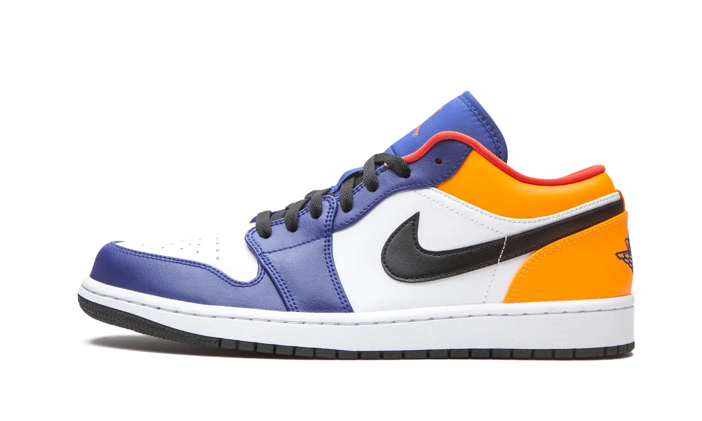 The Air Jordan 1 Low "Deep Royal/Yellow" is a colorful look for Michael Jordan's first signature shoe in low-top height. The upper features white leather on the mid-panel and perforated toe. Deep Royal leather paneling appears on the forefoot, eyelets, and toe cap. Smooth yellow leather dots the collar and heel. A black leather Swoosh marks either side of the shoe, and navy blue "Wings" embroidery can be found on the heel. The liner displays a Track Red trim, and black cotton laces sit atop the blue nylon tongue.