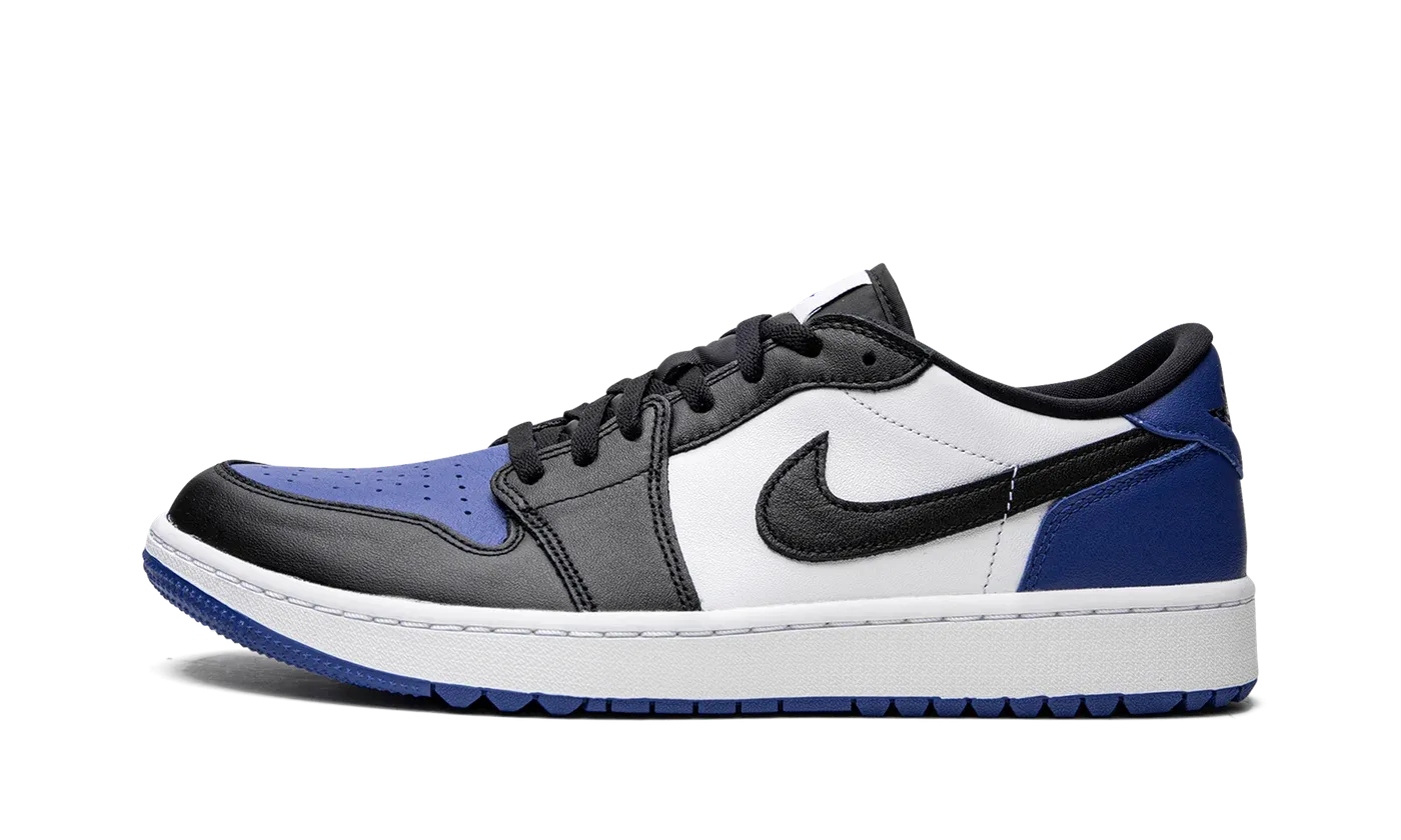 The Air Jordan 1 Low Golf "Royal Toe" is a modified version of the retro basketball shoe designed for golf in a colorway inspired by an original Jordan 1. The shoe in question is the Jordan 1's "Black Toe," which features a white leather toe and black forefoot. Here, the "Royal Toe" mimics the color block, but with Sport Royal leather on the toe and black leather on the forefoot. The mid-panel features white leather and the heel is designed in royal blue leather. A black leather Swoosh appears on the sides and a black "Wings" logo dots the heel. "Jordan Golf" branding is found on the tongue tag. Small nubs on the outsole provide traction on a golf course.