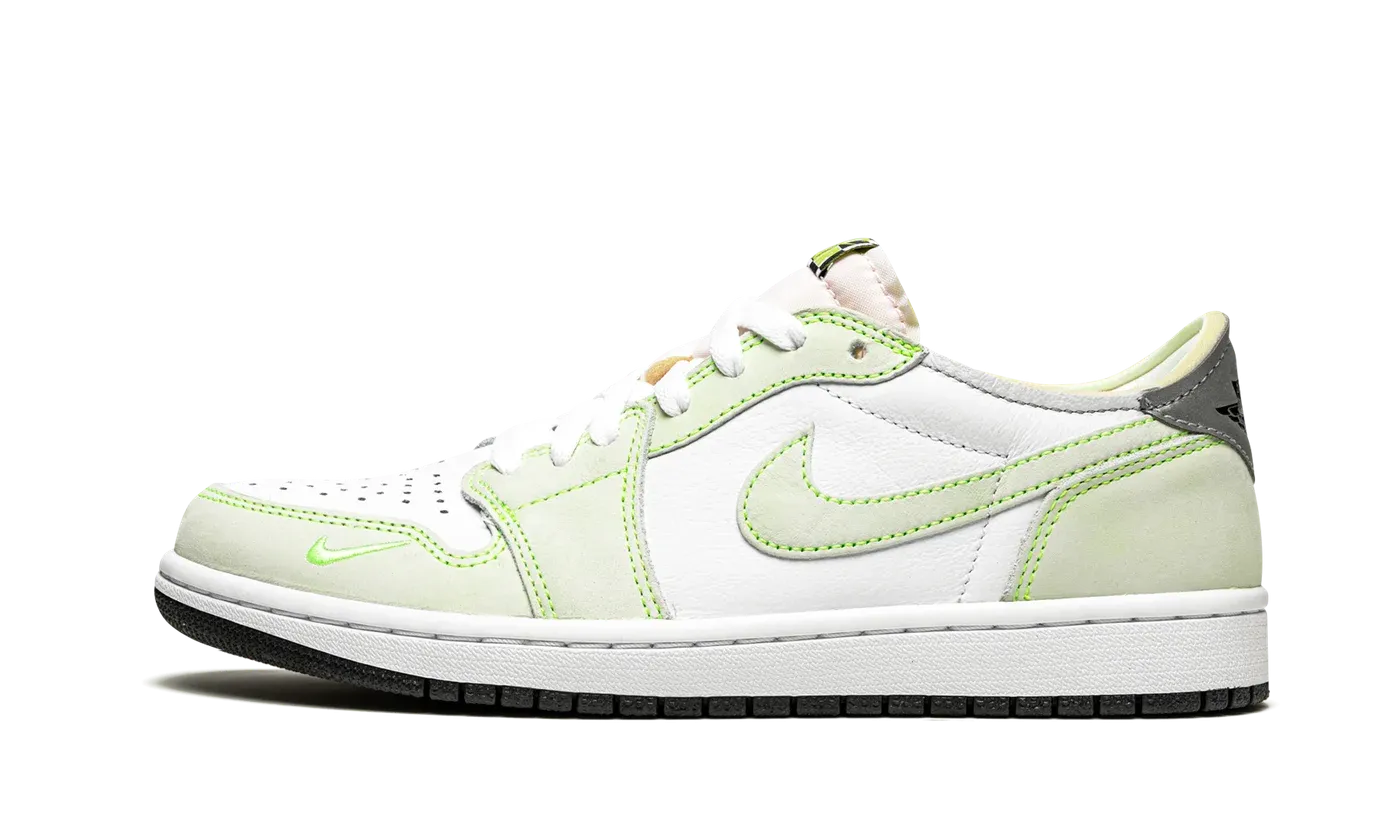 The Air Jordan 1 Low OG "Ghost Green" is a modified version of Michael Jordan's first signature shoe that introduces new design details to the model. In low-top form, the "Ghost Green" Jordan 1 features a predominantly two-tone white and pale green color block. The forefoot, eyelets, collar, heel, and Swoosh display a Ghost Green leather construction. The perforated toe and mid-panel are constructed in white leather. A small embroidered Swoosh appears on the forefoot, a design that was not on the original Air Jordan 1 Low from 1985. Elsewhere, a "Wings" logo appears on the grey leather heel tab. Exposed foam padding can be found around the collar. No doubt retro-inspired, a black-and-green checkerboard pattern with a Ghost Green "Nike" logo appears on the nylon tongue tag on the cream-colored tongue. The design is similar to the look of the tongue tags of vintage Nike tennis shoes from the 1980s. A two-tone white midsole and black outsole finish off the look. Release date: May 21, 2021.
