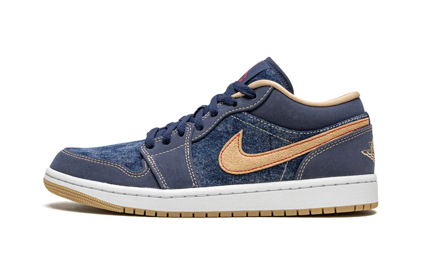 The Air Jordan 1 Low SE "Denim" is a unique look for the low-top version of Michael Jordan's first signature that features a denim construction. Skewing toward the casual lifestyle category, the "Denim" edition of the vintage basketball shoe is complete with a durable blue denim base and Midnight Navy nubuck overlays. A tan suede Swoosh appears on either side of the shoe and a tan Wings logo is embroidered onto the heel. Additional branding appears in the form of a red Jumpman with "Air" on the tongue. A blue "23" logo is embroidered on the lace overlay. The inner lining appears in the same beige color as the Swoosh and "Wings" logo.