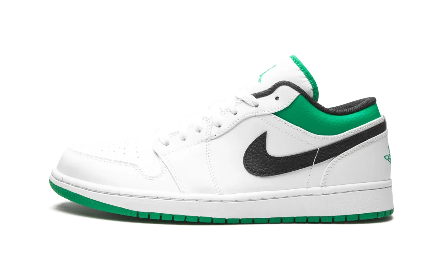The Air Jordan 1 Low "White/Lucky Green" unofficially honors a longtime rival of Michael Jordan's Chicago Bulls: the Boston Celtics. The "White/Lucky Green" colorway of Michael's legendary first signature shoe was released in Spring 2021 and features the white, black, and green color scheme of the Celtics' team uniforms. Without saying as much, the assortment of colors is a nod to the Celtics. White tumbled leather forms the base of the shoe. A black tumbled leather Swoosh appears on both sides and a Lucky Green embroidered "Wings" logo on the heel. Additional green accenting can be found on the leather panel on the collar and on the underside of the white nylon tongue. Jordan Brand adds a black Jumpman to the forward-facing side of the tongue for a timeless, retro look.