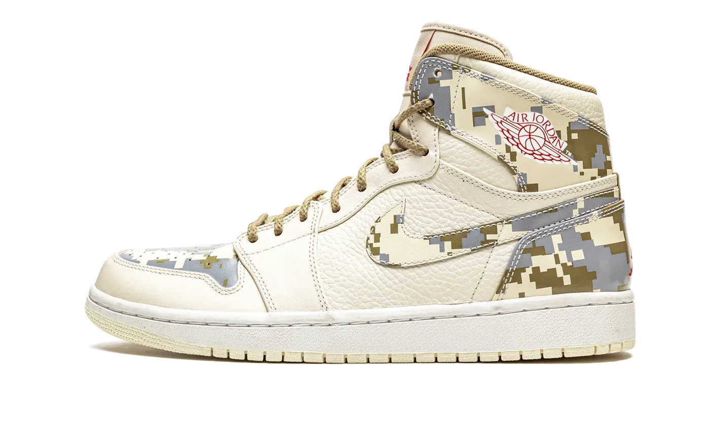 The Air Jordan 1 High OG Sample "Digi-Camo" is an unreleased sample version of Michael Jordan's first signature shoe in a military-influenced colorway. The rugged appearance of this sneaker is highlighted by its brown rope laces and earth tone leather design with contrasting digital camo details. Specifically, the perforated toe, collar, heel, and Swoosh feature a brown, green, and beige digi camo pattern that contrasts with the tan leather that appears on the forefoot, mid-panel, and eyelets. A red Jumpman logo is found on the tongue tag on the tan nylon tongue. This limited "Digi-Camo" look features a white midsole and beige outsole. Please note: this item's box and product label are damaged.