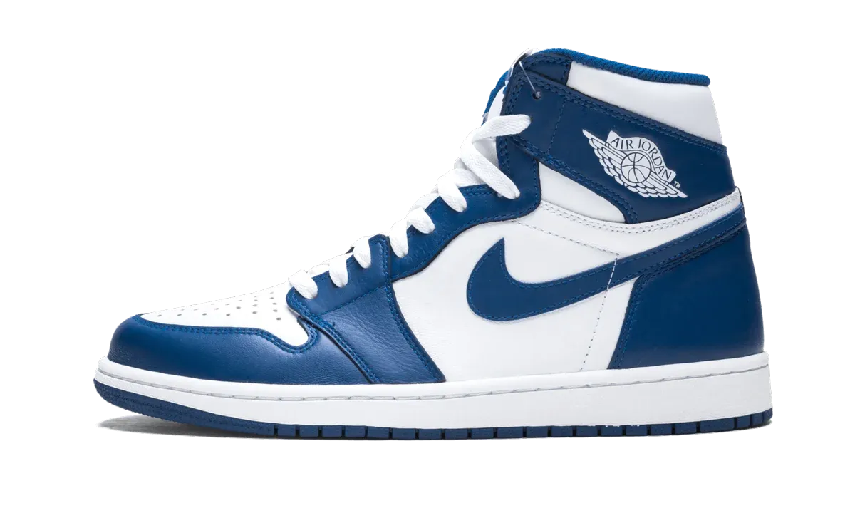 The Air Jordan 1 High OG "Storm Blue" is an original colorway of Michael Jordan's first signature shoe that was re-released in 2016. The "Storm Blue" is one of multiple designs of the retro basketball shoe to originally release back in 1985. A popular look that draws similarities to the Nike Dunk's "Kentucky" colorway, the "Storm Blue" was never worn by Jordan in the NBA, and didn't receive a retro release until 2016. The modern "Storm Blue" is nearly identical to the first version of the white-and-blue colorway, as it features white tumbled leather on the perforated toe, mid-panel, collar, and heel. Contrasting Storm Blue leather appears on the overlays and Swoosh branding. A white "Wings" logo is found on the collar and blue "Nike Air" and Swoosh detailing is printed on the white nylon tongue tag on the white nylon tongue. White laces, a white midsole, and a Storm Blue-colored rubber outsole all complete the look. The Air Jordan 1 High OG "Storm Blue" was referenced by Union for the fashion boutique's Air Jordan 1 "Storm Blue" collaboration in 2018.