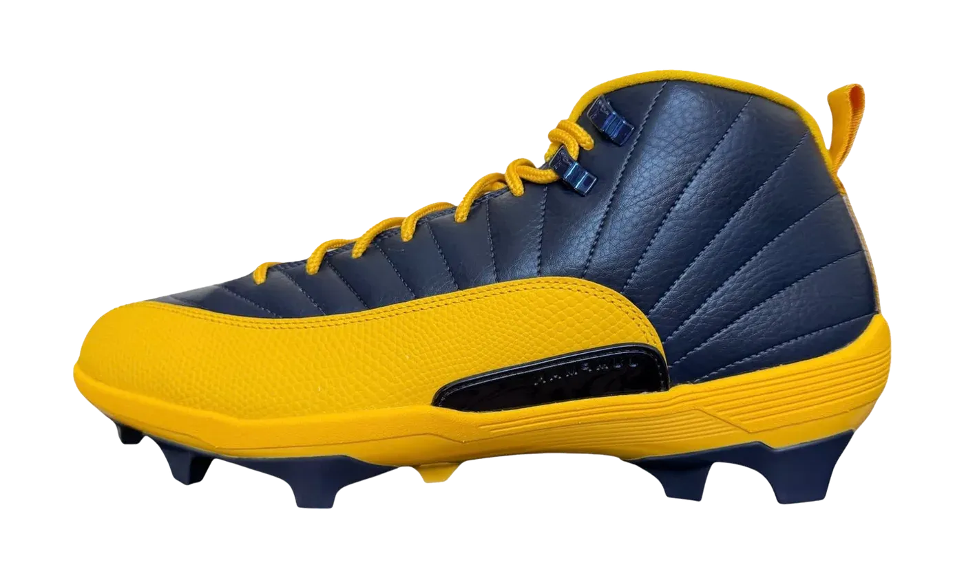 Get ready for game day with the Air Jordan 12 Savage 3 PE Cleats 'University of Michigan'. These Player Exclusive cleats are a rare fusion of athletic performance and iconic heritage, showcasing the legendary AJ12 silhouette. They feature a durable, textured leather upper in a bold Navy Blue with Maize (University Blue/Yellow) accents, representing the Wolverines' classic colors. Built with a cleated sole for superior traction on the field, this piece of exclusive gear is a must-have for the dedicated collector or ultimate Michigan fan.