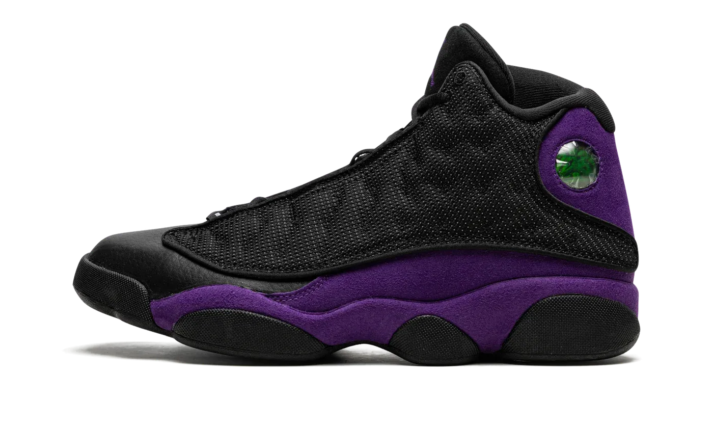 The Air Jordan 13 "Court Purple" is a January 2022 release of the retro basketball shoe in a colorway that shows love to the team uniform colors of the Los Angeles Lakers. The "Court Purple" edition of Michael Jordan's thirteenth signature shoe is yet another popular colorway that pays respects to the Lakers—the first being the aptly named "Lakers" makeup that was released in July 2019. Sans any official Lakers branding, the "Court Purple" nonetheless features the Lakers' color palette on its design. The "Court Purple" mimics the color block of the Jordan 13's original "Bred" colorway by substituting the red accenting for purple along the heel and mudguard. The black mesh upper is treated to a 3M reflective finish. A holographic emblem denoting Jordan's "Black Cat" nickname, meant to resemble a panther's eye, can be found on the heel. A Court Purple embroidered Jumpman is found on the tongue and white "Jordan" detailing appears on the vamp. Black midsole walls complete the look. Release date: January 8, 2022