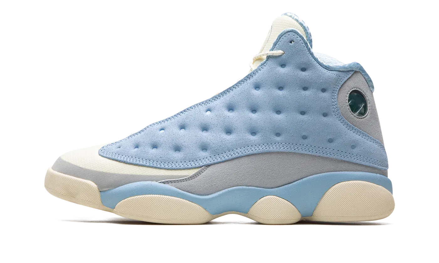 The SoleFly x Air Jordan 13 "I'd Rather Be Fishing" is a collaboration between the Miami-based retailer and Jordan Brand on a pastel-based colorway of the vintage basketball shoe. Michael Jordan's thirteenth signature shoe receives a warm-weather-inspired makeover by SoleFly, the Miami sneaker boutique owned by Carlos Prieto, who is Jordan's brother-in-law. The "I'd Rather Be Fishing" Jordan 13 features cream ripstop detailing on the toe, grey suede overlays on the heel and above the midsole, and a light blue dimpled upper. The Jordan 13's signature holographic "panther eye" is found on the lateral side. Additional branding elements include mismatched Jumpman and "SoleFly" logos on each tongue, and an elephant print inner lining. A light blue mudguard contrasts the cream midsole walls. Release date: December 2, 2022