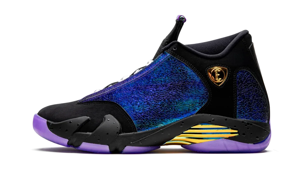 The Air Jordan 14 Doernbecher is a special colorway of Michael Jordan's fourteenth signature shoe created by patient Ethan Ellis as part of the annual Doernbecher Freestyle Collection. The beloved series designed by patients at the Doernbecher Children's Hospital in Portland, Oregon has produced some of the most memorable Air Jordan designs within the line's storied history, and this remixed version of the Jordan 14 is certainly no different. The upper features black nubuck covering the toe, collar, and part of the mid-panel, while a purple synthetic material with a crinkled texture on the midfoot and heel is a nod to the TCU Horned Frogs, Ethan's favorite college team. He also includes personal details like the number of heart surgeries he'd endured, the city of his heart transplant, the names of the hospitals where he's received care and the name of a patient he befriended that went through a similar treatment. Even more special details include the Seattle Space Needle on the left shoe's heel, a water droplet texture on the midsole, and "EE" replacing the Jumpman on the ankle logo badges. The Air Jordan 14 Doernbecher was released on December 7, 2019.