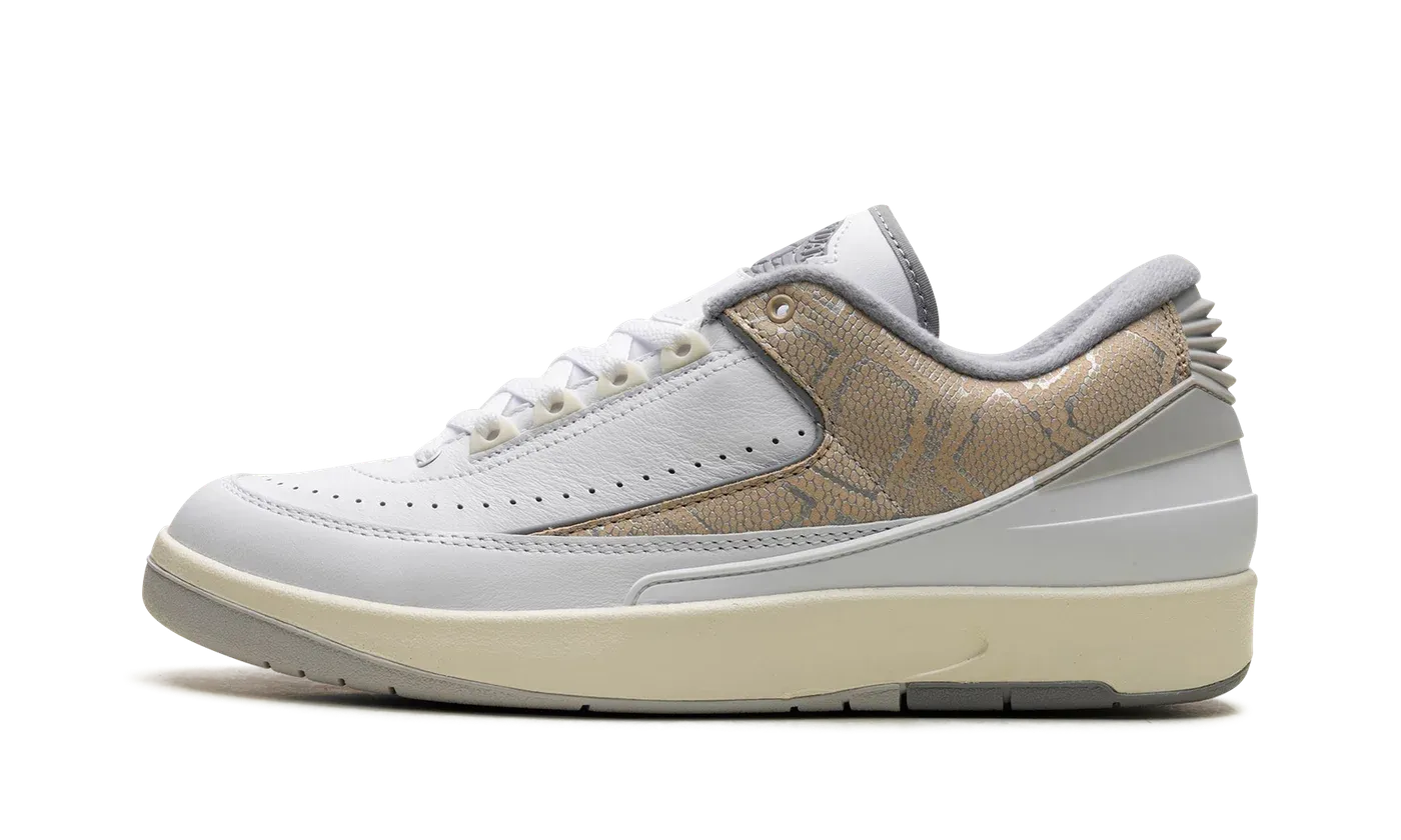 The Air Jordan 2 Low "Python" is the colorway of Michael Jordan's second signature shoe inspired by the Nike Air Python. Originally released in 1987 and said to be a combination of the Nike Air Force 2 and Jordan 2, the Air Python is known for its faux lizard skin material on its design, which is the material that inspires the reptilian detailing on the Jordan 2 Low "Python." The upper has a white leather construction and with a brown-based snakeskin pattern on the mid-panel overlay. An old school grey "Wings" logo is seen on the tongue. Underfoot, a Sail midsole sits on top a Cement Grey rubber outsole, completing the look. Release date: February 7, 2024